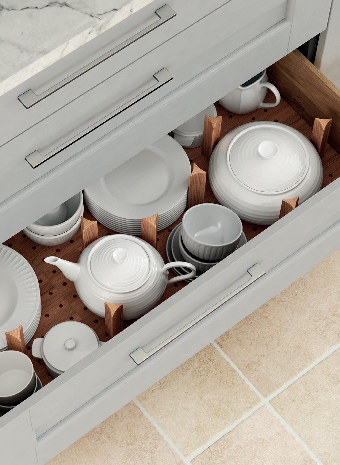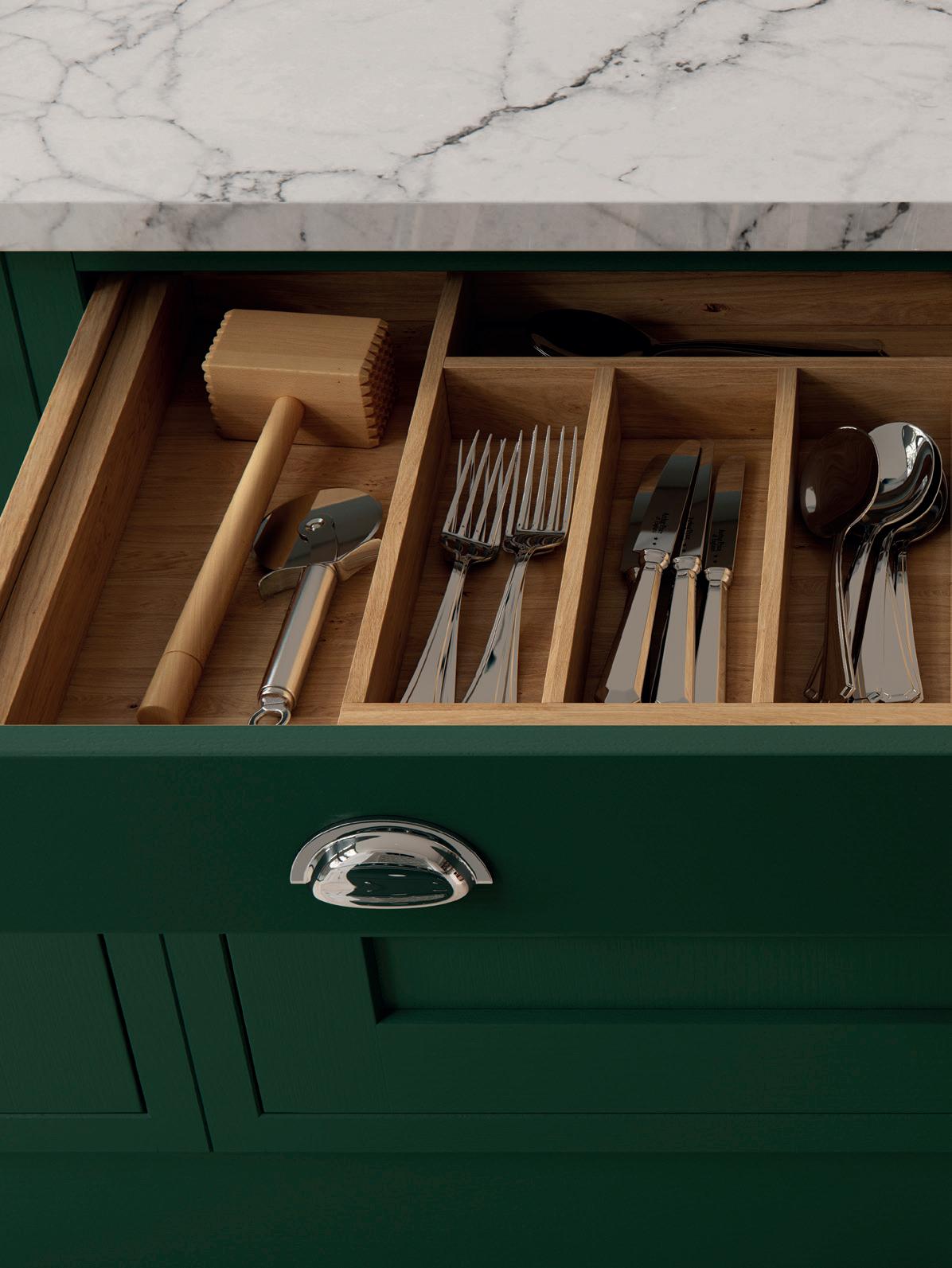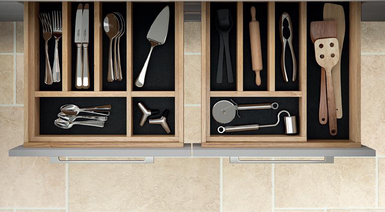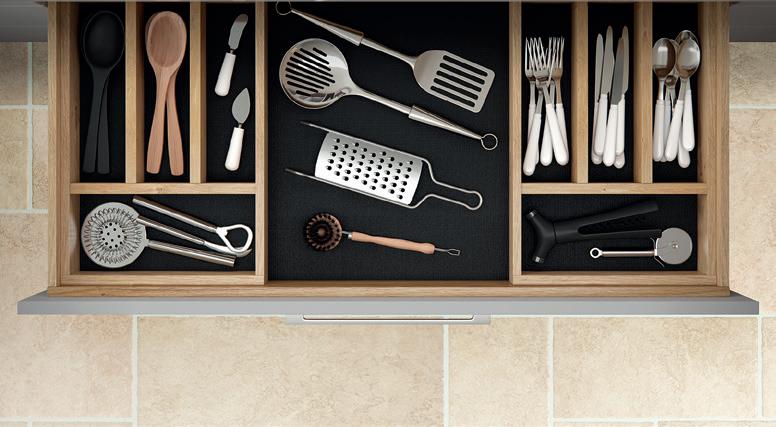 Everything has its place in solid oak drawers with cutlery inserts that can be positioned any number of ways to create the ideal storage arrangement. Antislip mats mean you’ll always find utensils and cutlery exactly where you left them.
