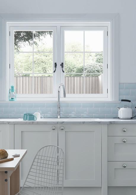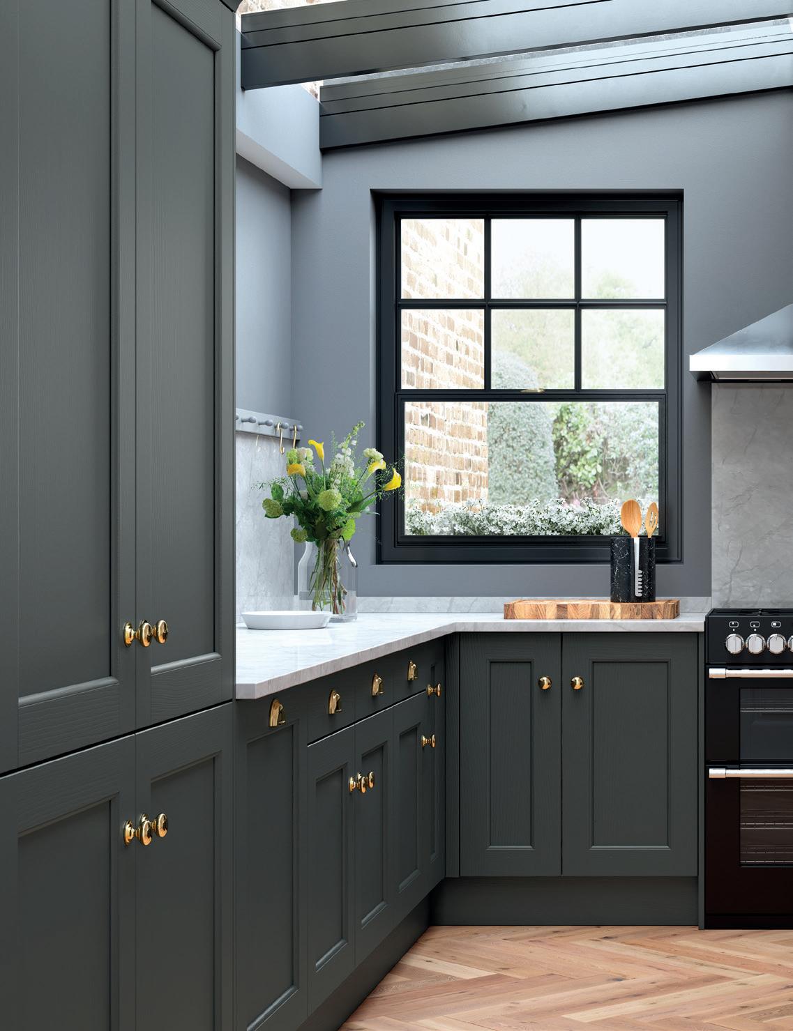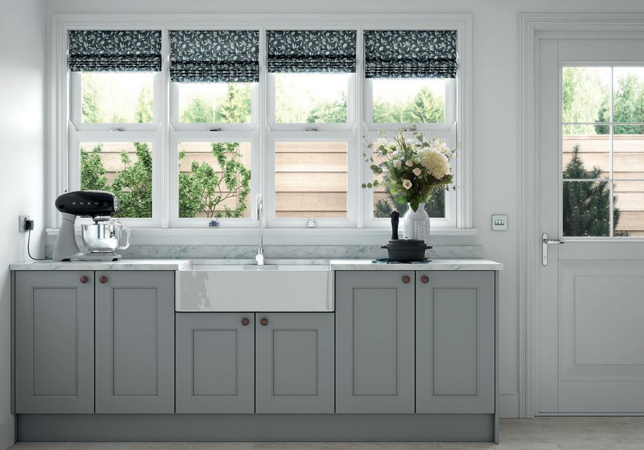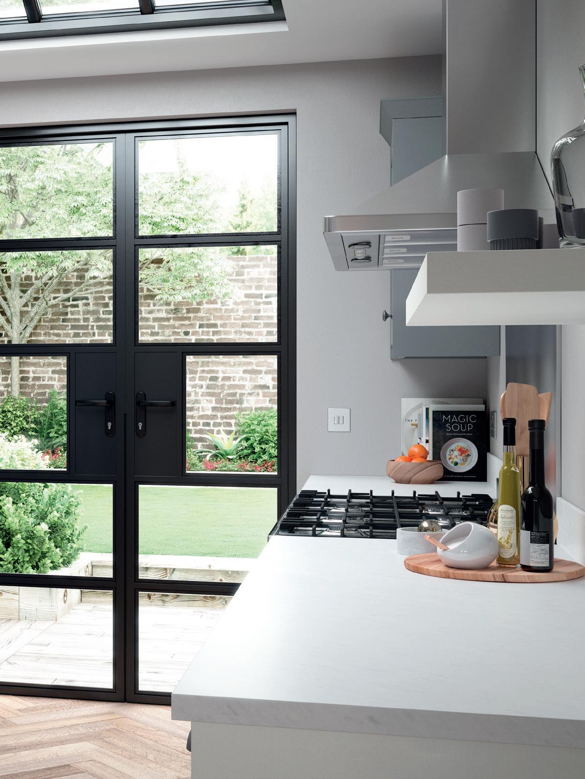 WHERE SPACE IS LIMITED, a simple galley kitchen in a single minded colour scheme will make the most of what’s available. This Eastdon design in Porcelain and Luna appears even roomier thanks to the double French windows.