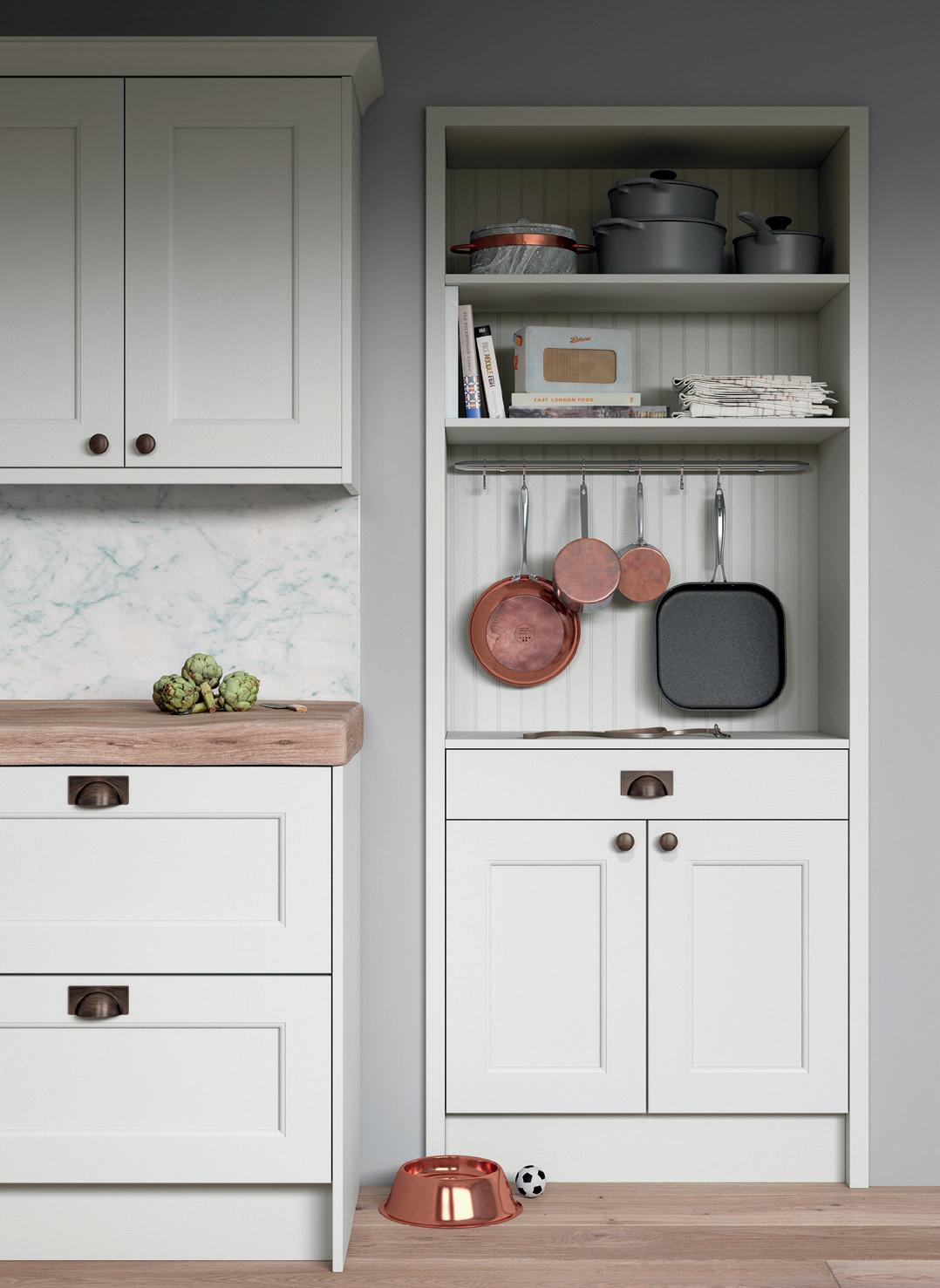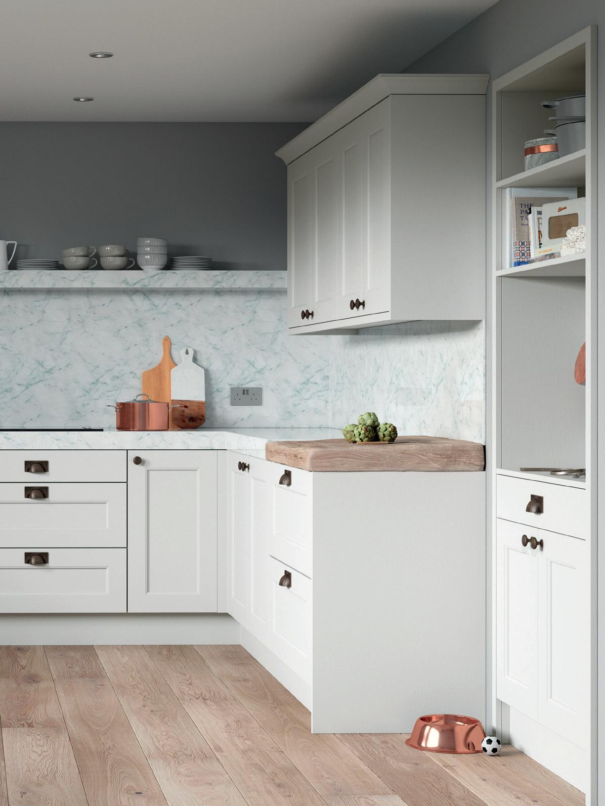 IN ALLESTREE, shaker takes on a softer touch with a rounded bead inside the door panel and a gentle Light Grey and Luna colour scheme. American Copper knob and cup handles are a rustic finishing touch.