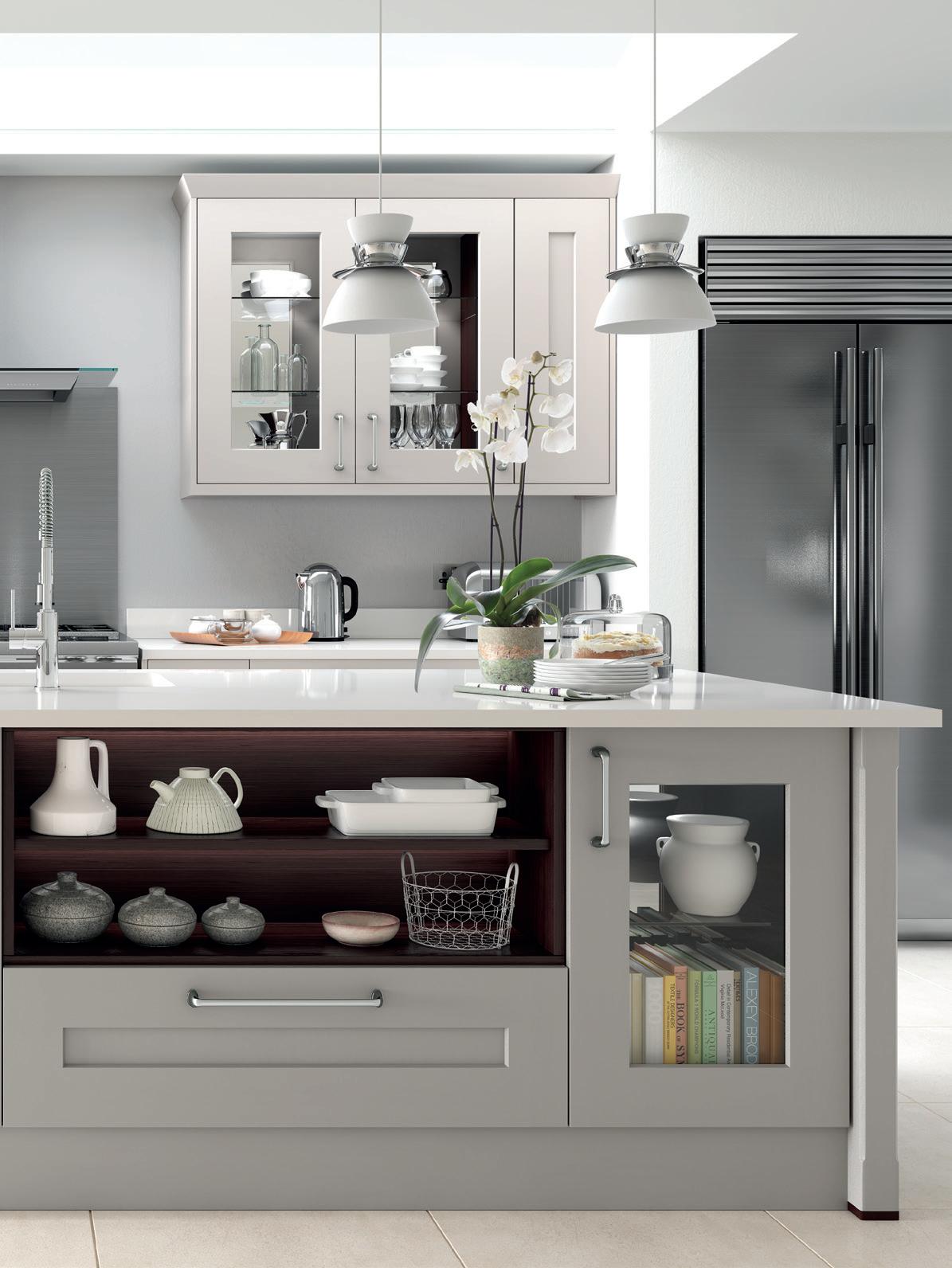 COMBINING GLAZED wall units with open shelving not only serves to break up the uniformity of a long wall. It also increases the options for designers and adds flexibility to your kitchen storage. The island hob allows for a ceiling mounted extractor – a clever innovation that opens up even more available space in a kitchen that is very much at the heart of family life.