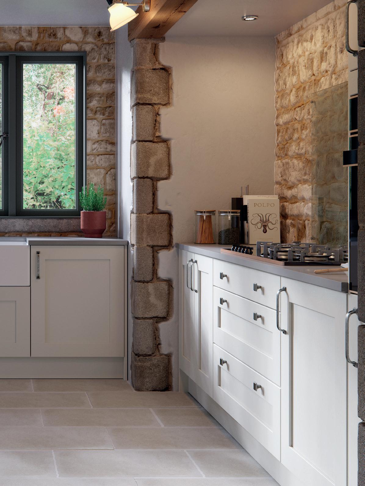 THE SMOOTH TONES of Calico contrast with the multi-textural appeal of exposed stonework and beams in a look that is carried on by stone flag flooring and industrial style downlights.