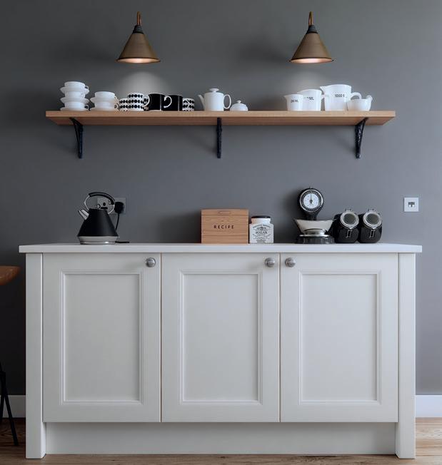 THE CLASSIC SHAKER is filtered through a 1950s inspired aesthetic in this Farringdon design, complete with smooth pastel painted shades, chrome knobs and retro white enamel cooker.