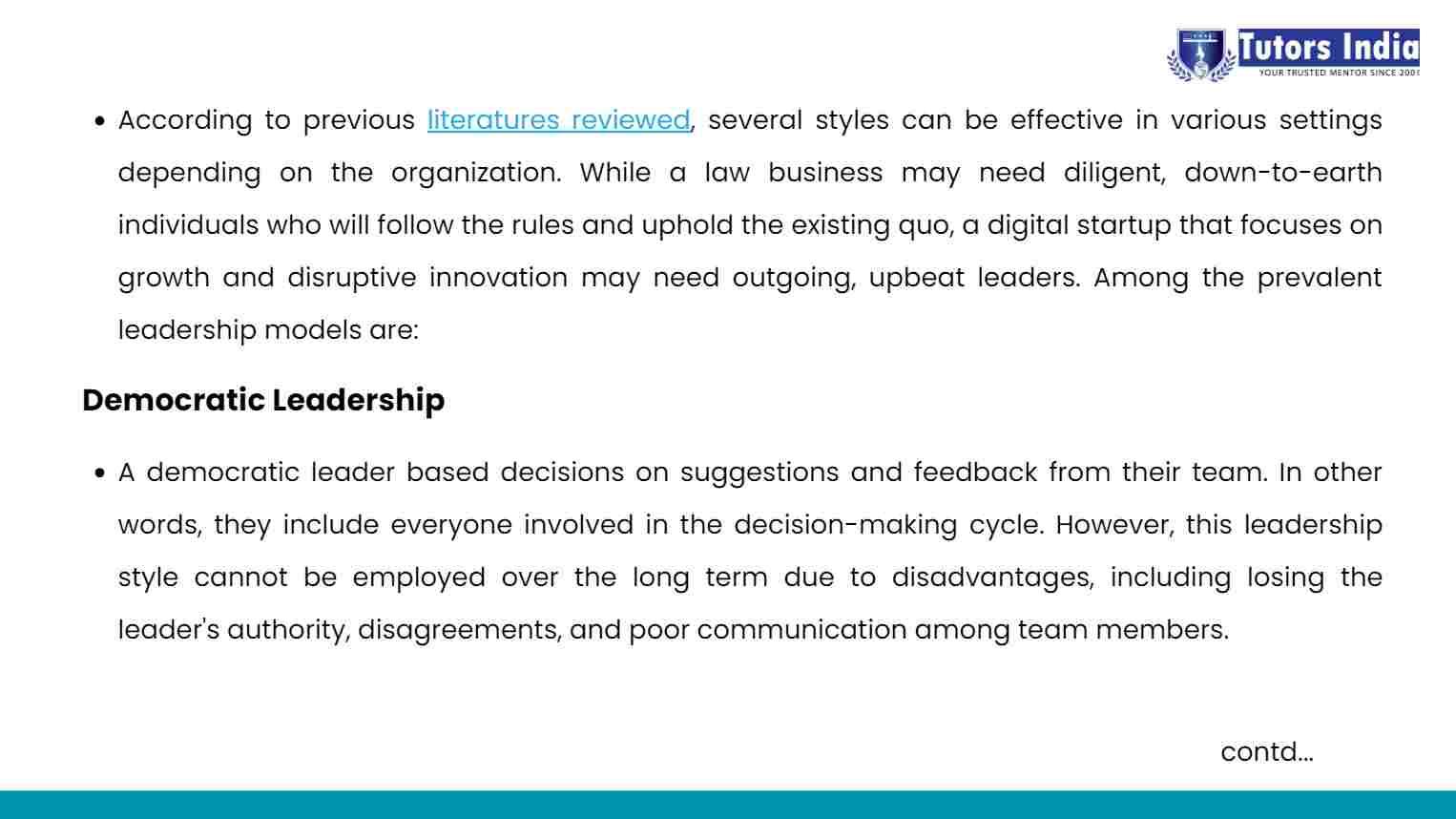 Tutors India assists PhD Scholars in writing their master dissertation in leadership style’s and organisational Performnace.
