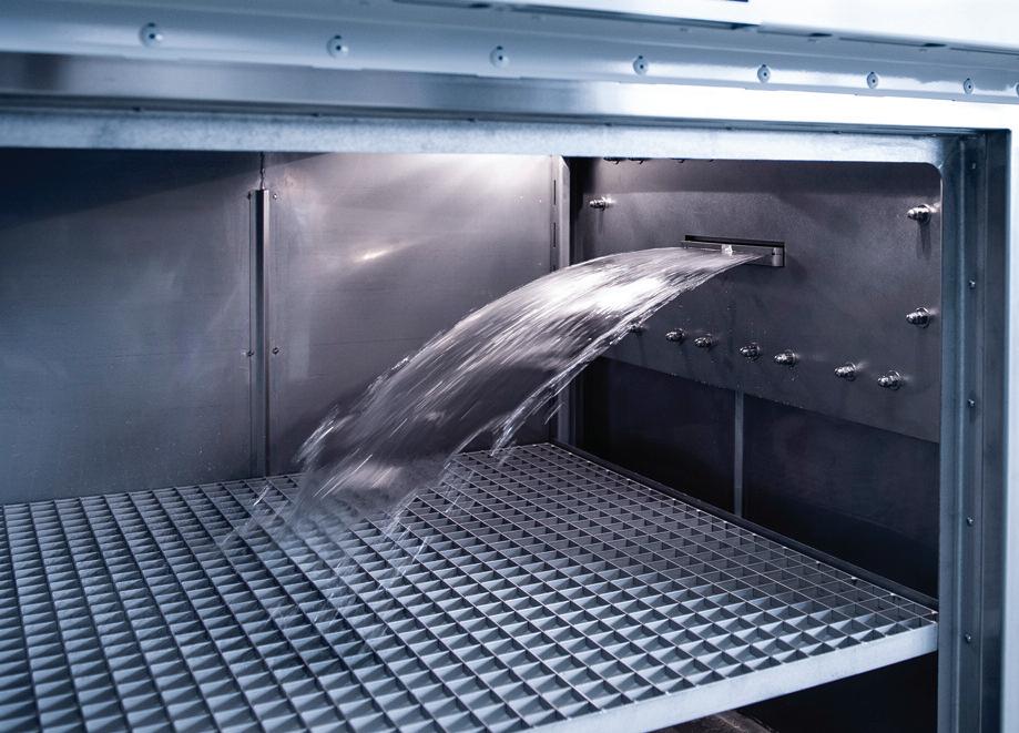 sitivi per prove con acqua e polvere (distribuiti in Italia da Crioclima srl), p r e s e n t a u n a n u o v a m a c c h i n a p e r prove “Splash Water”. S i t r a t t a d i u n a p r o v a a m b i e n t a l e p e r v e r i f i c a r e l a r e s i s t e n z a a s h o c k t er m ic i di c om ponent i e s is t em i (in a c c o r d o a ISO 16750 1 5) l o c a l i z z a t i n e l l e z o n e d e l v e i c o l o che possono essere colpi t e d a i m provvisi get ti d’acqua. Il test è impie g a t o a n c h e p e r v e r i f i c a r e l a t e n u t a degli involu cri. La camera di p ro v a v i e n e s c a l d a t a e ,