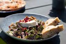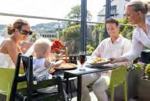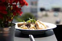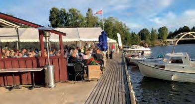 Omgivelsene er vakre og solrike, der du kan nyte god mat og drikke helt i vannkanten ved gjestehavna med båtene farende forbi, enten du ønsker å sitte under tak, parasoll eller åpen himmel.
