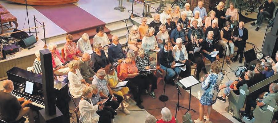 Arendal Demenskor under en lunsjkonsert under Arendalsuka 2024, der de fylte Trefoldighetskirken med over 500 begeistrede tilhørere. Foto: