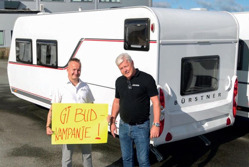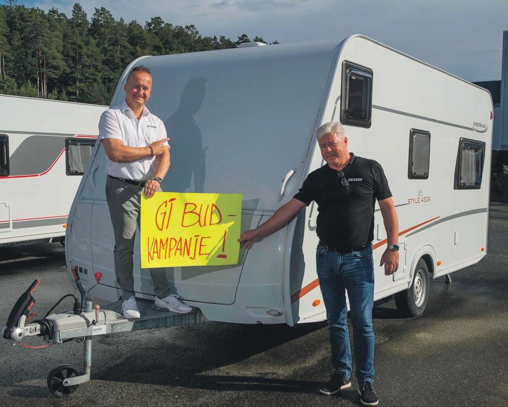 CAMPINGDRØM TIL NETTOPRISER: Håvard Nuland og Sebastian Fuhrmann her vært i sving med å ta imot bud på biler og vogner. Nå går de aller siste ut til nettopriser.