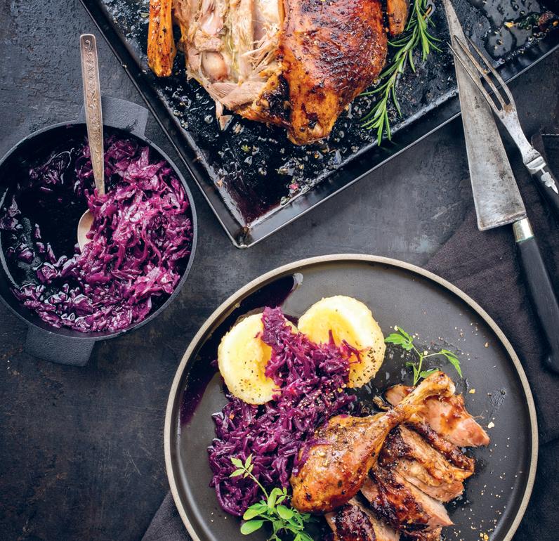 Andelår/overlår m/hjemmelavet rødkål, brune & hvide kartofler og andesovs