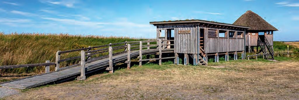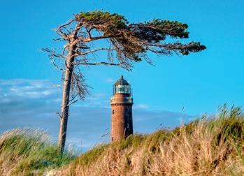 land-Darß-Zingst vom Festland trennt und erst in Ribnitz-Damgarten endet. Tipp: Für jeden Besucher eine 1-Euro-Münze mitbringen. Die verlangt der Automat am Eingang. Gleich neben dem Turm befindet sich das „Haus am Kliff“ mit einer modern gestalteten Ausstellung zur Tier- und Pflanzenwelt des Nationalparks Vorpommersche Boddenlandschaft.