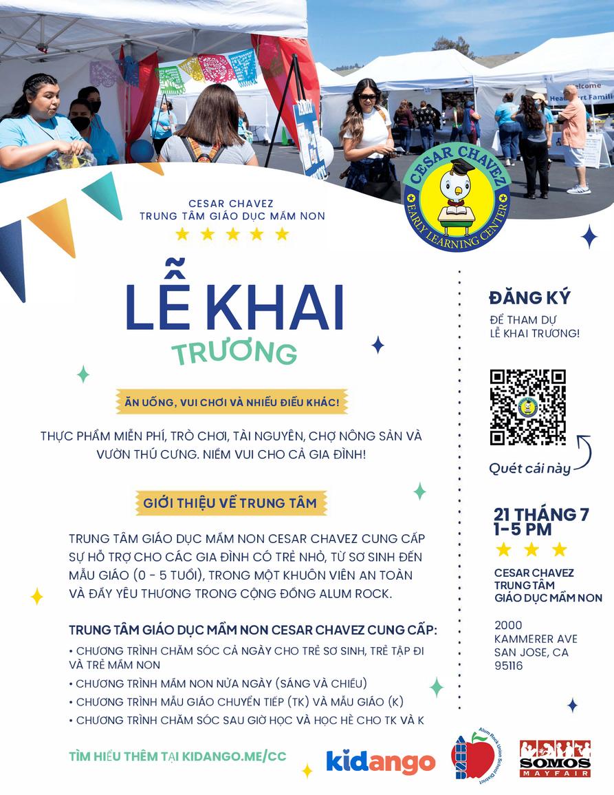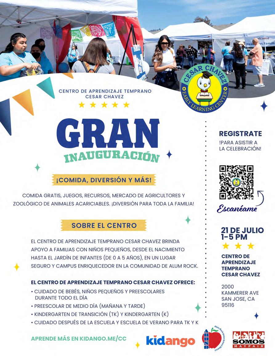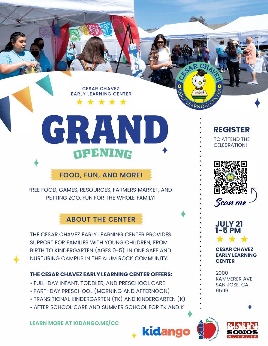 This historic grand opening will include fun for the whole family, including free food and drinks, games, raffle prizes, a farmers market, a petting zoo, and more. Don’t miss this day of summer fun! Learn more and register for the event at kidango.me/cc