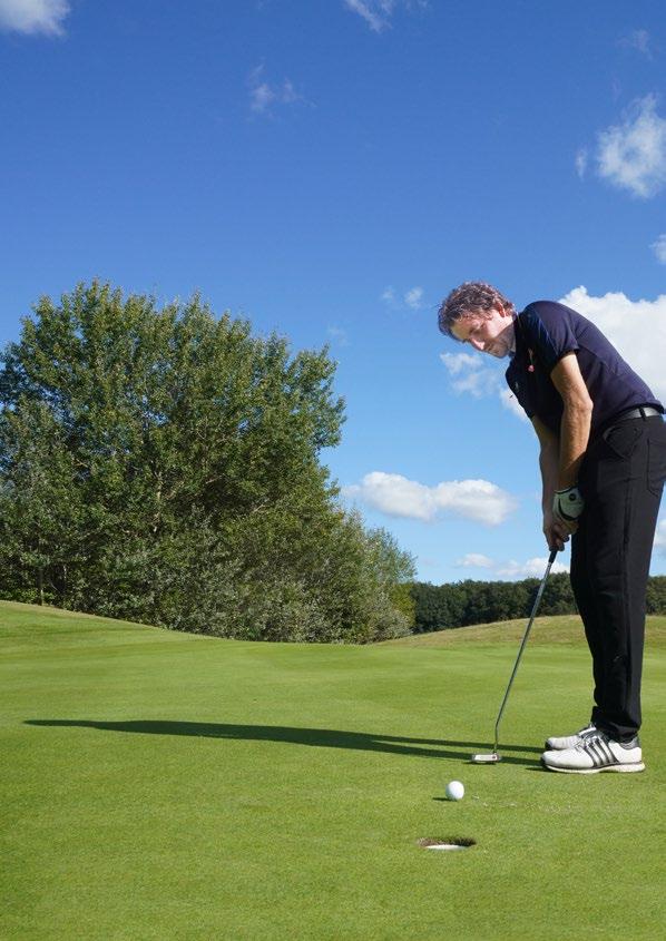 Op een zachte herfstdag in september voegt Mischa Vredeveld (37) meteen de daad bij het woord. Die morgen heeft hij net in geuren en kleuren ver teld wat hij verstaat onder de ideale golfdag. Onder een strakblauwe lucht wandelen over gladgeschoren greens, omringd door vrienden en vakgeno ten. Eerst een kopje soep, een broodje, een praatje en dan de baan op. Je ziet hem nooit met een bloedserieuze blik ruimschoots van tevoren op de driving range aan zijn swing werken. “Een paar putjes en dat is het.”