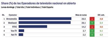 Canal Sur (8,0%) desciende una posición y es, junto a TV3 y La 7 TV (3,2%), las segundas cadenas que más pierden en el mes (-0,9). El canal andaluz firma su peor dato mensual de los últimos veintitrés meses.