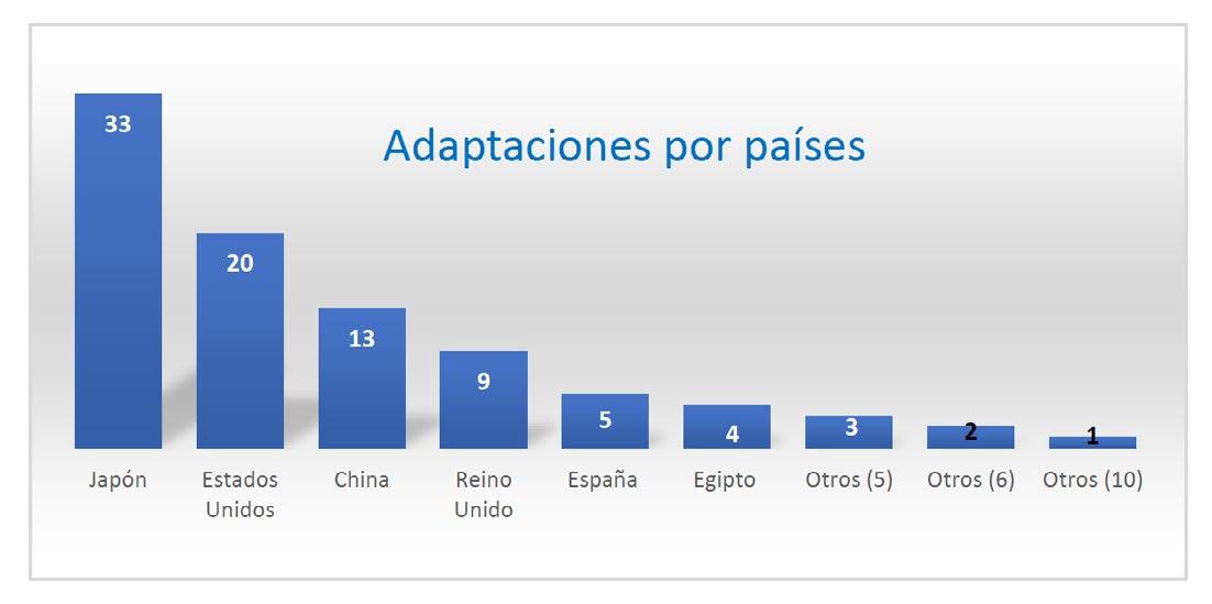 con Balto (Watch It) y se atreve con un clásico de Dumas. A continuación tenemos cinco países con tres adaptaciones. Corea del Sur con producciones destinadas al mundo web con webtoons, web comic y novela web. Brasil con novela clásica y cuentos populares, Italia con novelas de éxito, India con novela clásica y moderna, y Australia con historias reales. Hay seis países con tal solo dos adaptaciones y diez países en los que tan solo se ha llevado a cabo una adaptación en el periodo analizado.