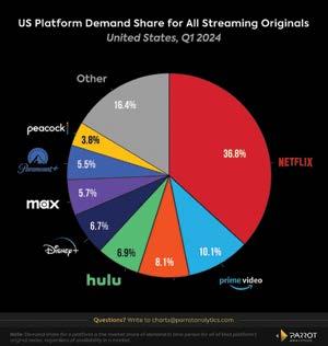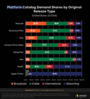 That said, the longterm viability of Peacock as a standalone streamer remains questionable. Even after steady growth, Peacock is stuck in last place among the major streamers in demand for its streaming original series. While it is making progress in total on-platform demand share, it still ranks just sixth in the category.