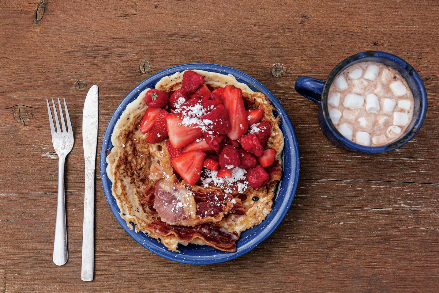 Acheery“hooowah!”greetsyouasyouapproachthe breakfastcamp.Juiceandhotchocolatearereadywith baconandastackoftastypancakes.Thewonderful smellsreallygetthetastebudshopping Sotieyour horseup,andcomeonoverbythecracklingfiretofill uponagoodheartybreakfast.