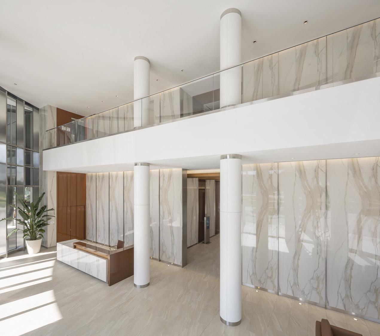 The new design represents a dramatic transformation into a modern fresh and bright interior fully visible from the exterior with particularly dramatic evening views. The entry façade received new broad radial cast stone steps. The former black granite bulkhead fascia was removed and replaced with beautiful black marble effect thin polished porcelain tile large format panels to create a proscenium effect framing the lobby opening. New taller, sleek stainless-steel column covers supporting a radiused stainless steel soffit and brow replaced the former glass reinforced concrete ornamental columns opening the view to both levels of the lobby. The new interior was significantly altered to create a very simplified solution that promoted the grandness of the open two levels. The bowfront balcony was removed to provide for a long span white bulkhead with clear glass handrail. The lobby of former stone and wood wainscot was replaced with white Calcutta marble effect porcelain tile that extends vertically across both levels of the lobby façade. Each five foot wide panel of tile is divided with stainless steel bar reveals with uplighting from the floor as well as wall grazing lighting above. The new walls are complemented by wood colored back painted glass, wood ribbed millwork in the elevator lobby ceiling and new light-colored porcelain tile flooring that flows throughout both levels as well as through to the exterior of the entry plaza. New slender column covers in white Corian further highlight the two-story space with a refined elegance. With a complement of new reception desk, furnishings, and artwork the Two Town Center property now showcases as if it were a new building.