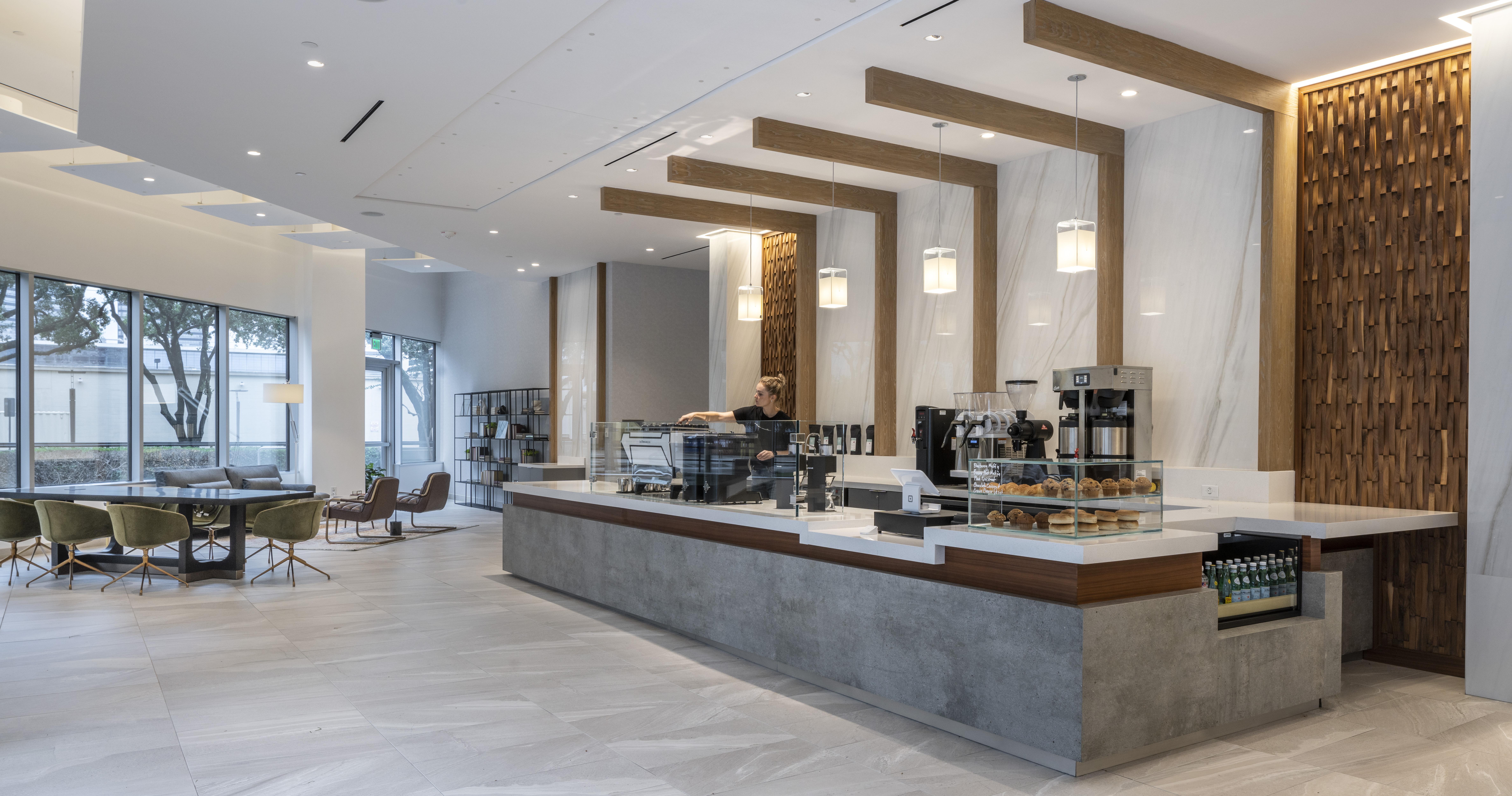 The lobby transformation included a new coffee and seating area to give tenants and visitors the best hospitality experience when visiting the 1400 Four Oaks building. Giving the space a new identity with the more contemporary, clean finishes and offering a more open and brighter space to welcome tenants and visitors.