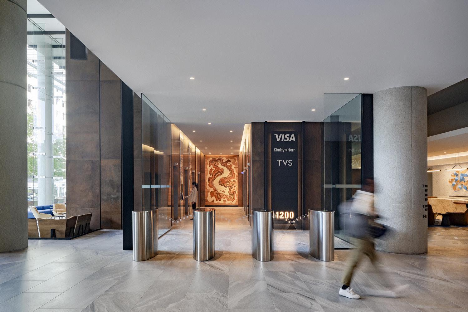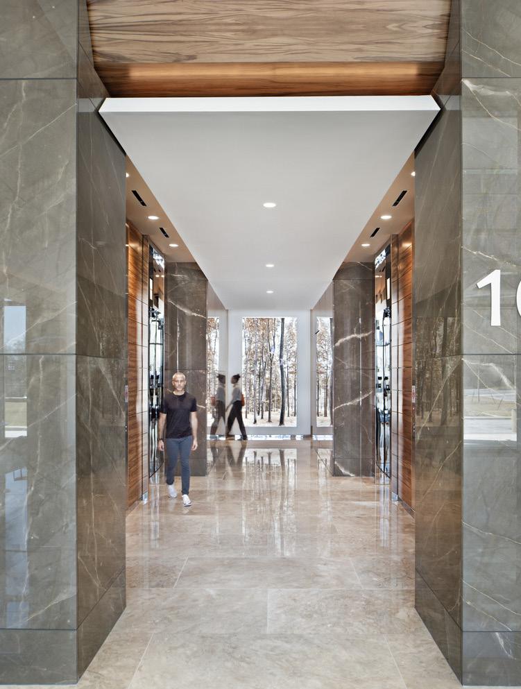 The elevator lobbies are clad with stone-look porcelain tile that shimmers in contrast to the warm wood vertical pillars flanking each elevator cab entrance. The back wall of each lobby features a striking stone look porcelain tile that beckons the finishes from the lobby. The ceiling heights in both the elevator lobbies and the entries leading into each lobby, are heightened to give a sense of grandeur that mimics the six-story lobby. Upgraded finishes continue within the corridors that lead into the restrooms giving the entire building a fresh new look that is consistent in design with the lobby. New textures and natural finishes introduced through fresh building materials and fixtures in these areas provide a clean and sophisticated environment.
