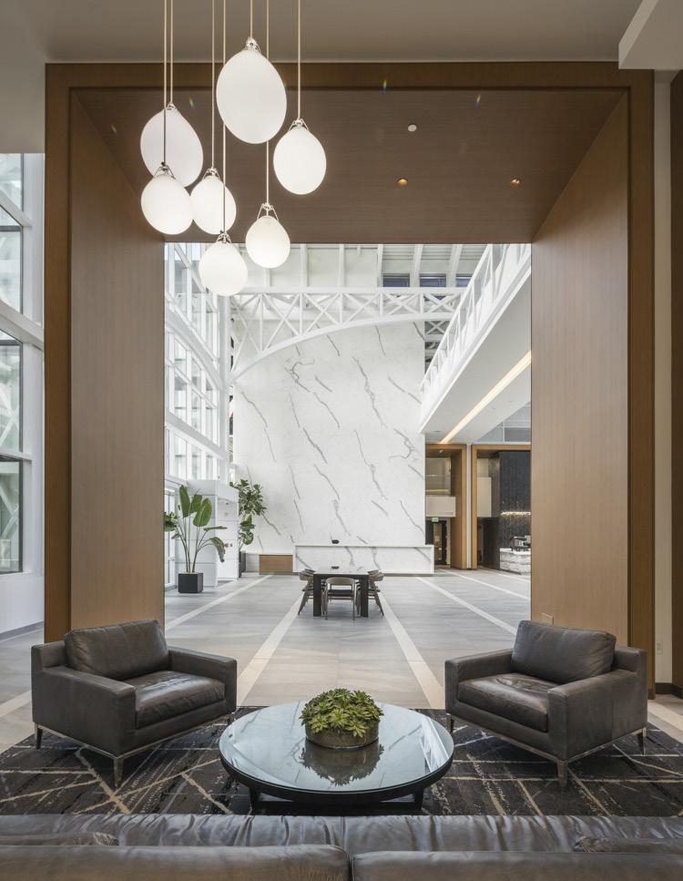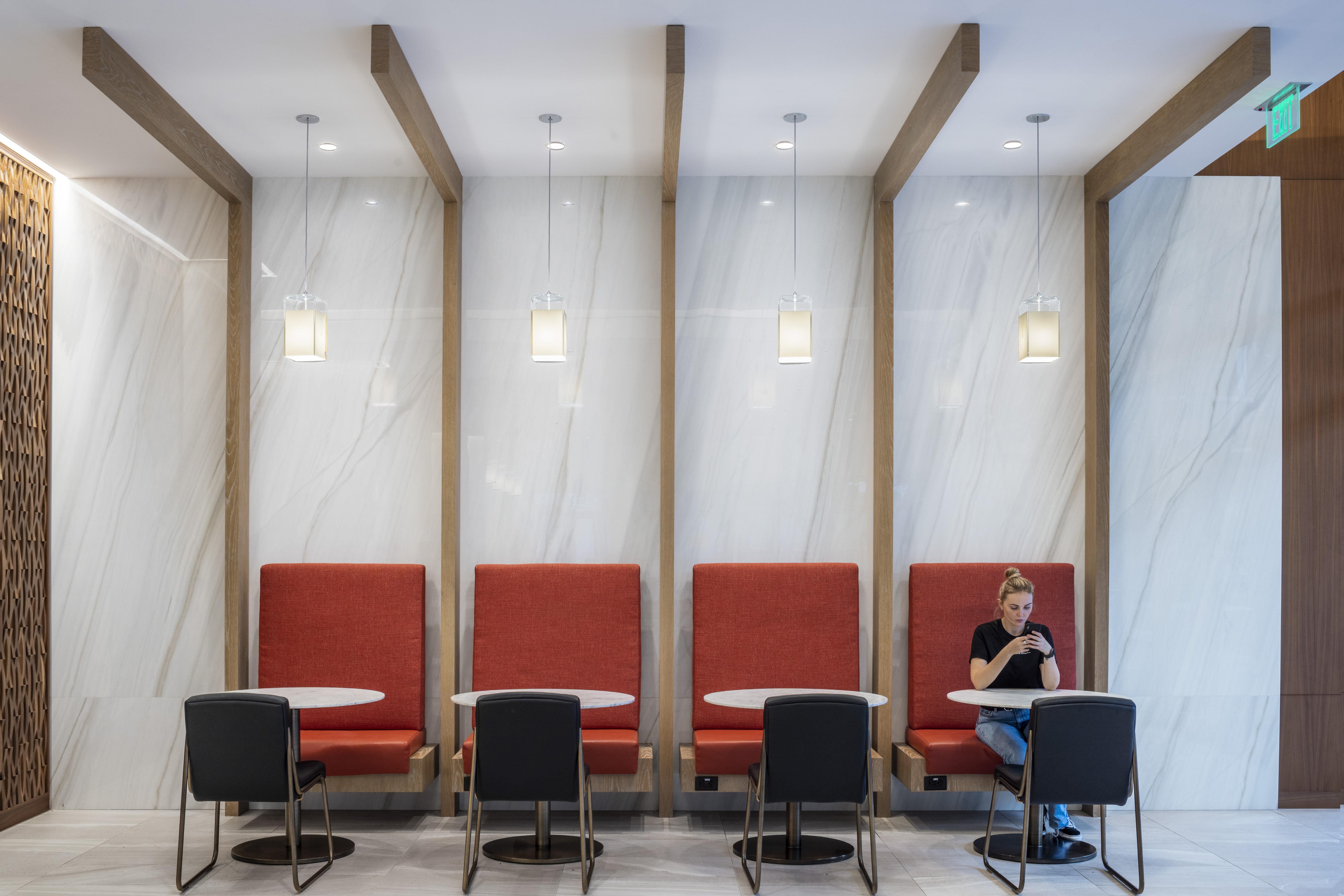 On the interior, all finishes were removed along with the stair and fountain and existing concierge desk. The two major interior elevations of the atrium were redesigned to provide wood effect portals and three-story tall thin large slab porcelain tile that looks like Calcutta marble. The concierge desk was relocated, and a new coffee kiosk was incorporated to activate the new refreshed public space.