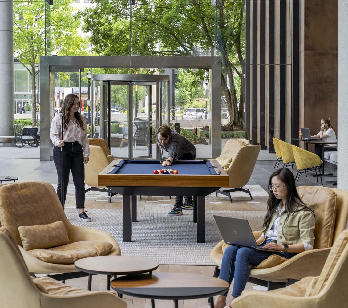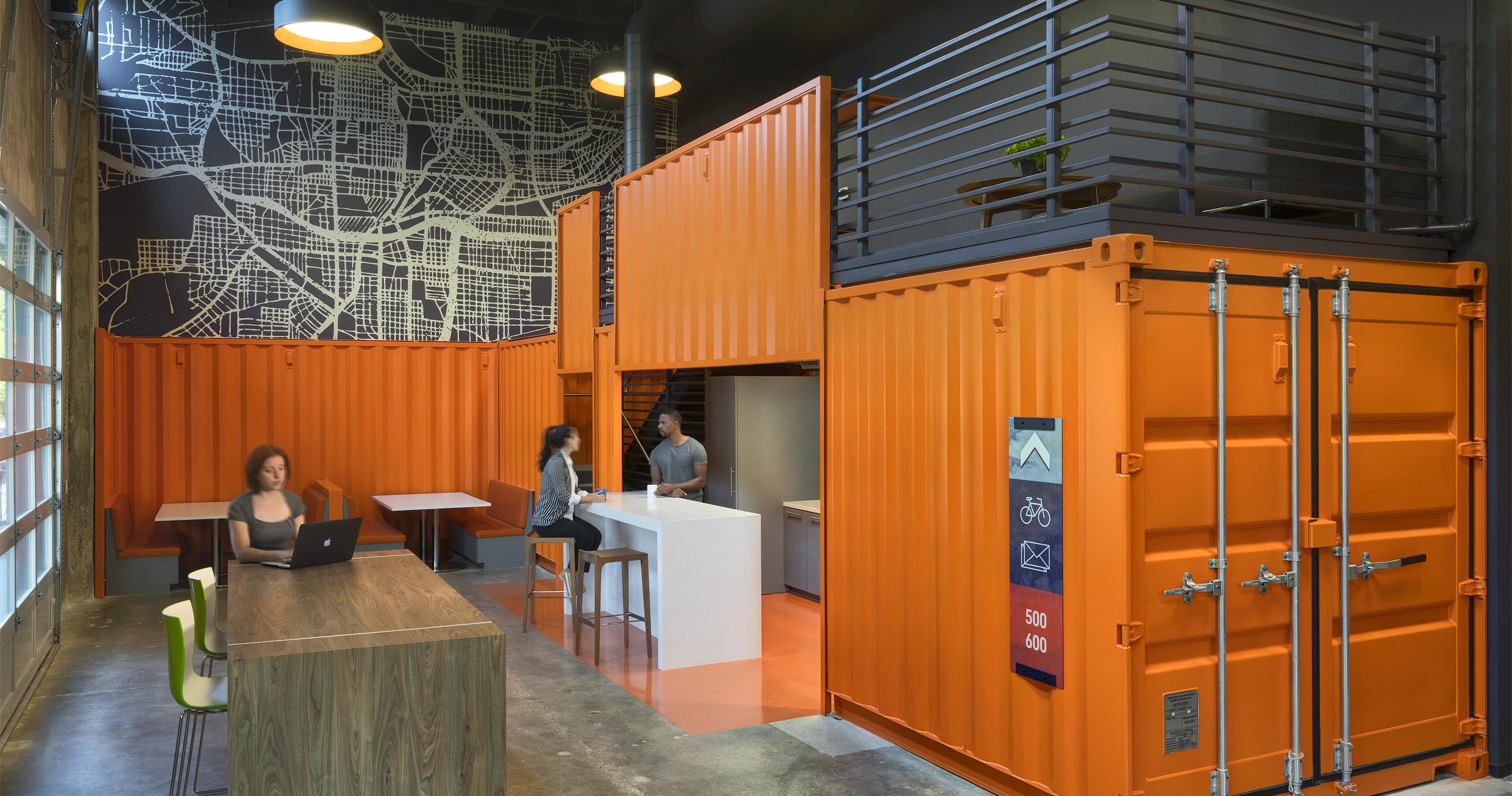 Located between the Georgia World Congress Center and Georgia Tech, the property is owned by MetLife and leasing is managed by Cushman & Wakefield. TVS was hired to help envision a new approach for multitenant office uses that featured shared community amenities, including a storage container breakroom, bike storage and showering facilities. This refresh was intended to serve as a model for the owner’s rebranding effort for the entire campus.