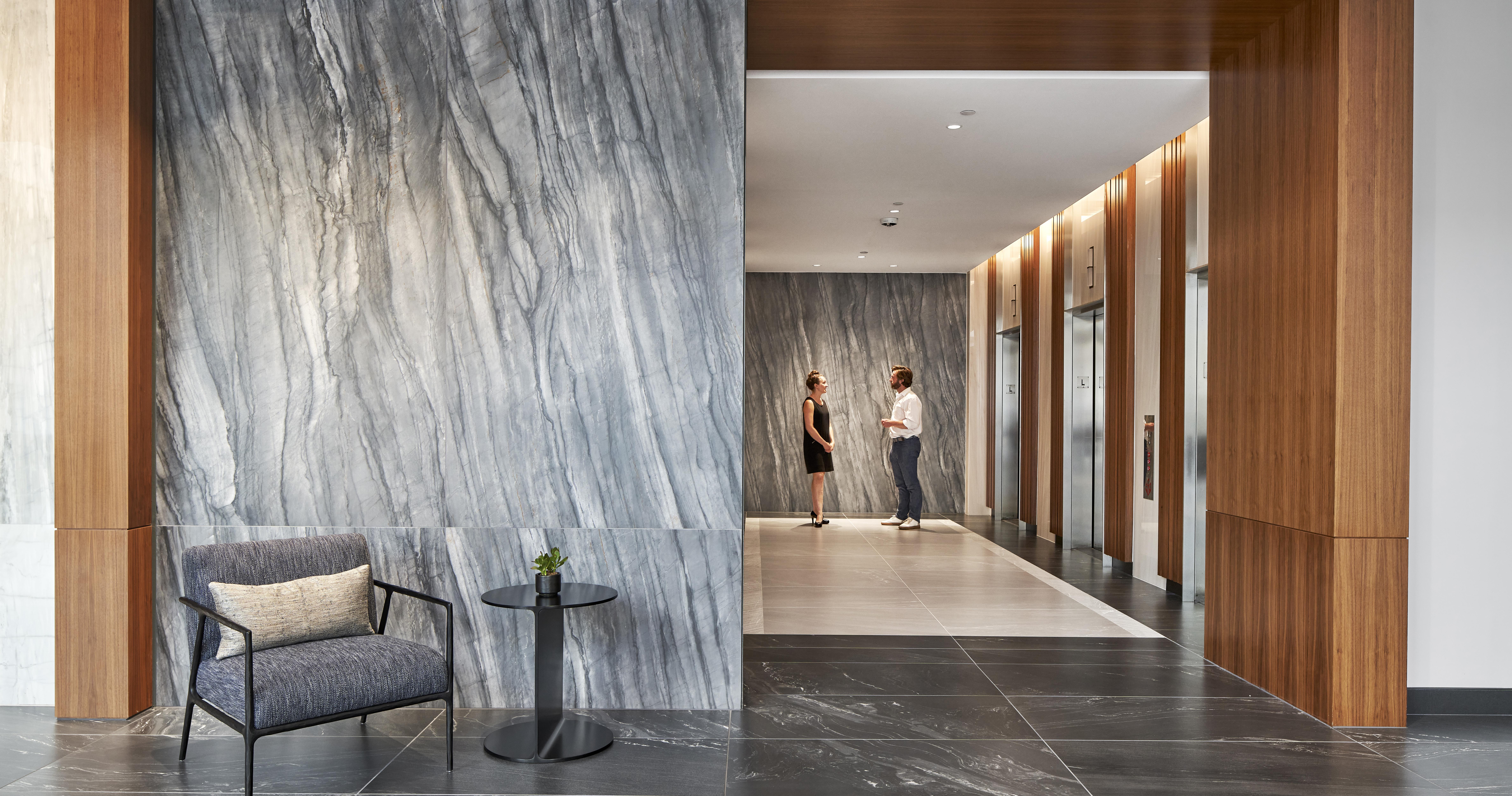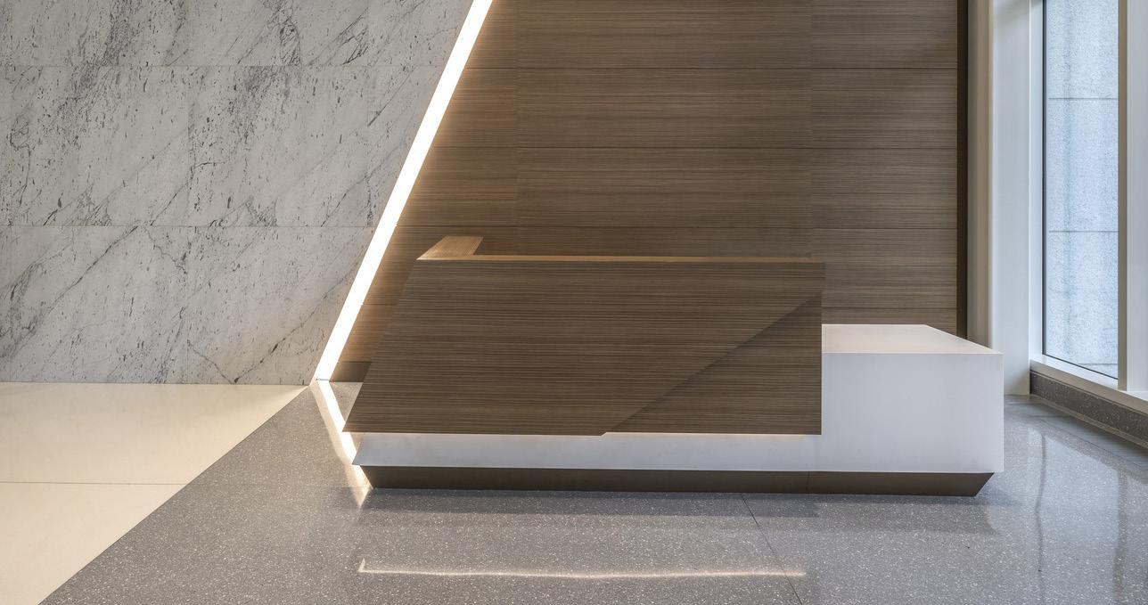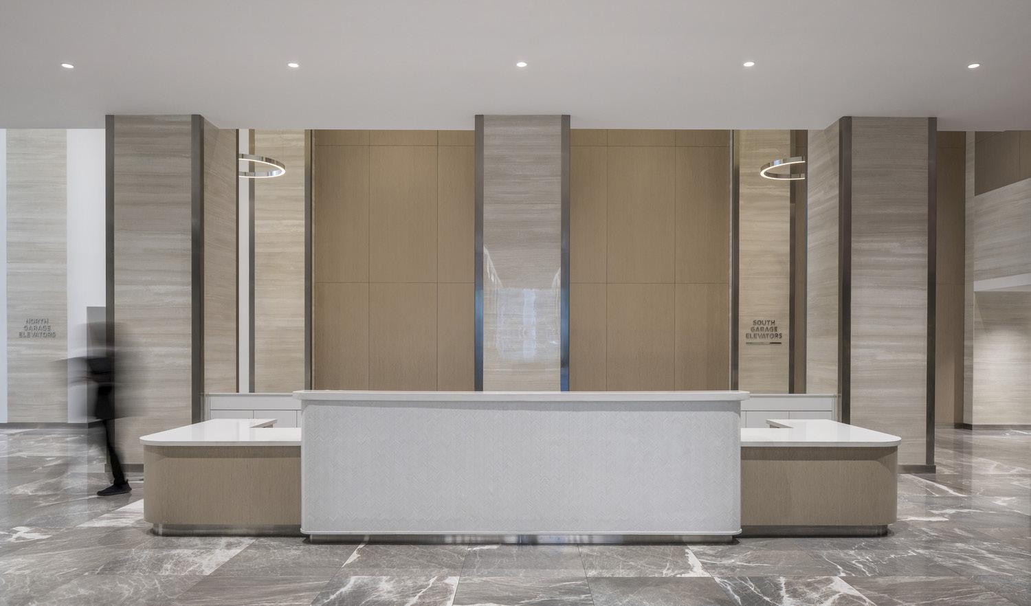 The goal of the new lobby design was to simplify and soften. Several aspects of the original space were kept, such as green marble stone, some of the architectural forms and use of glazing systems, preserving the integrity of the building. The new added materials and finishes amplify existing elements. This was achieved through the use of quality finishes that are refreshing to the space.