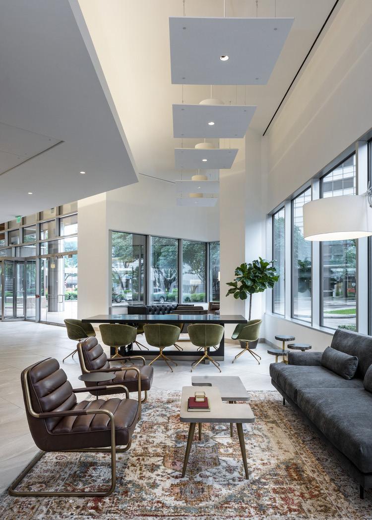 The new 333 Commerce reimagines what was a dated lobby and common area with fresh design elements that enhance the existing architectural features while visually connecting the Tower Building and the Auxiliary Building. A refreshed reception, lobby seating and elevator lobby give an unforgettable first impression imbued with Southern hospitality. This transformative renovation includes the entry portal and storefront, refined articulation to the balconies, new furniture groupings, overtop one-of-a-kind woven rugs and custom lighting that come together to provide a welcoming visitor experience. By unifying the existing architectural forms with linear connecting lines, elements throughout the lobby now feel pure, refined and purposeful. The subtle use of textures and a neutral finish palette that speaks to its surroundings, such as the river and the nature that Nashville is known for, bring a sense of serenity and luxury to the building.