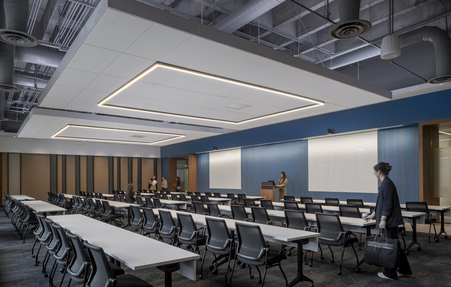 Newly designed and constructed conference rooms offer large flat screens, programmable lighting and motorized shades that provide an upscale space to suit a variety of corporate training needs with the touch of a button. These rooms open up to one oversized training room or are divisible into two large conference rooms through the use of an operable partition. The use of wood and textures continues into these rooms as well. Adjacent to the conferencing is a hospitality-driven prefunction space with a nearby catering pantry that allows guests to congregate prior to the main event.