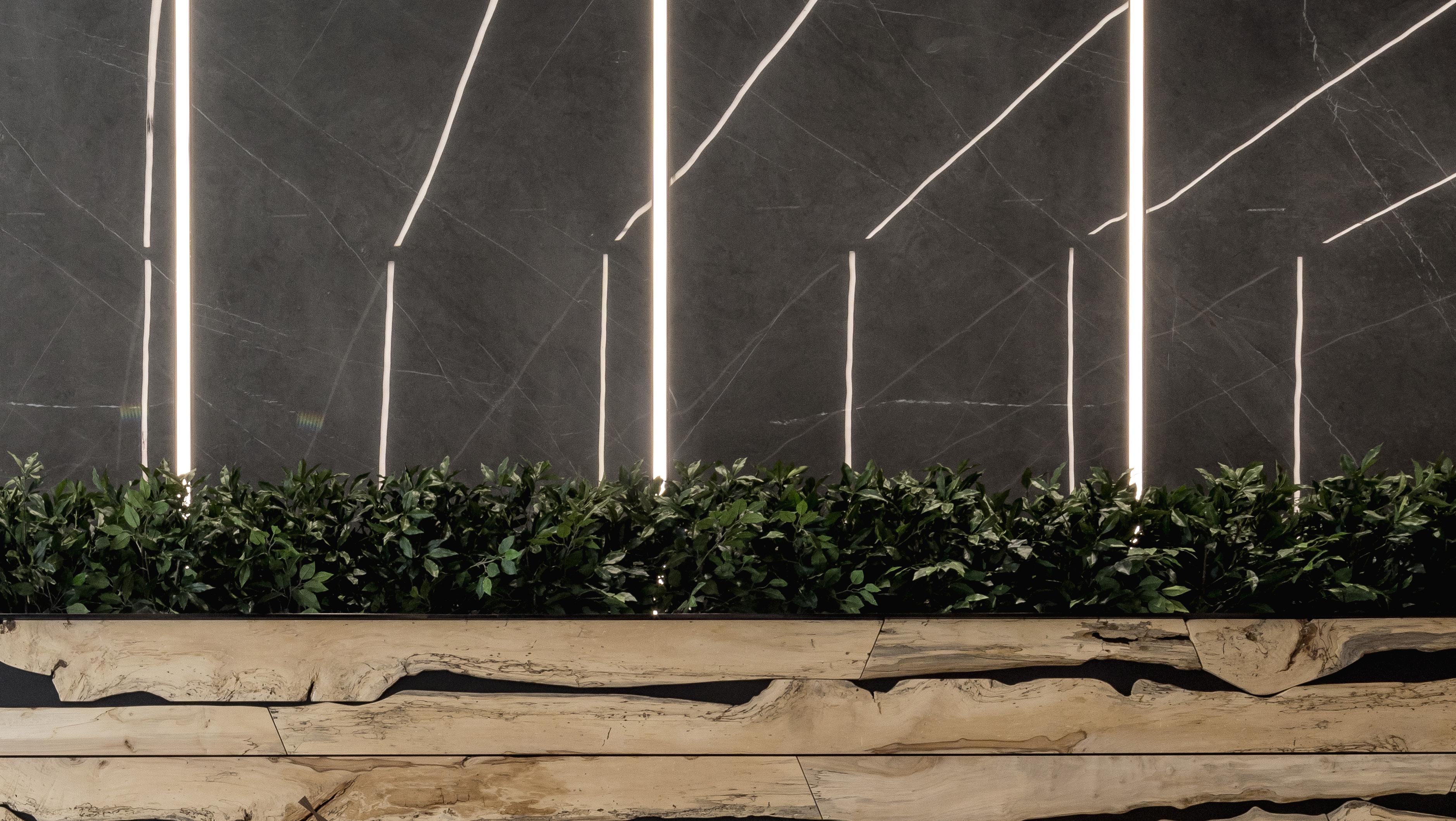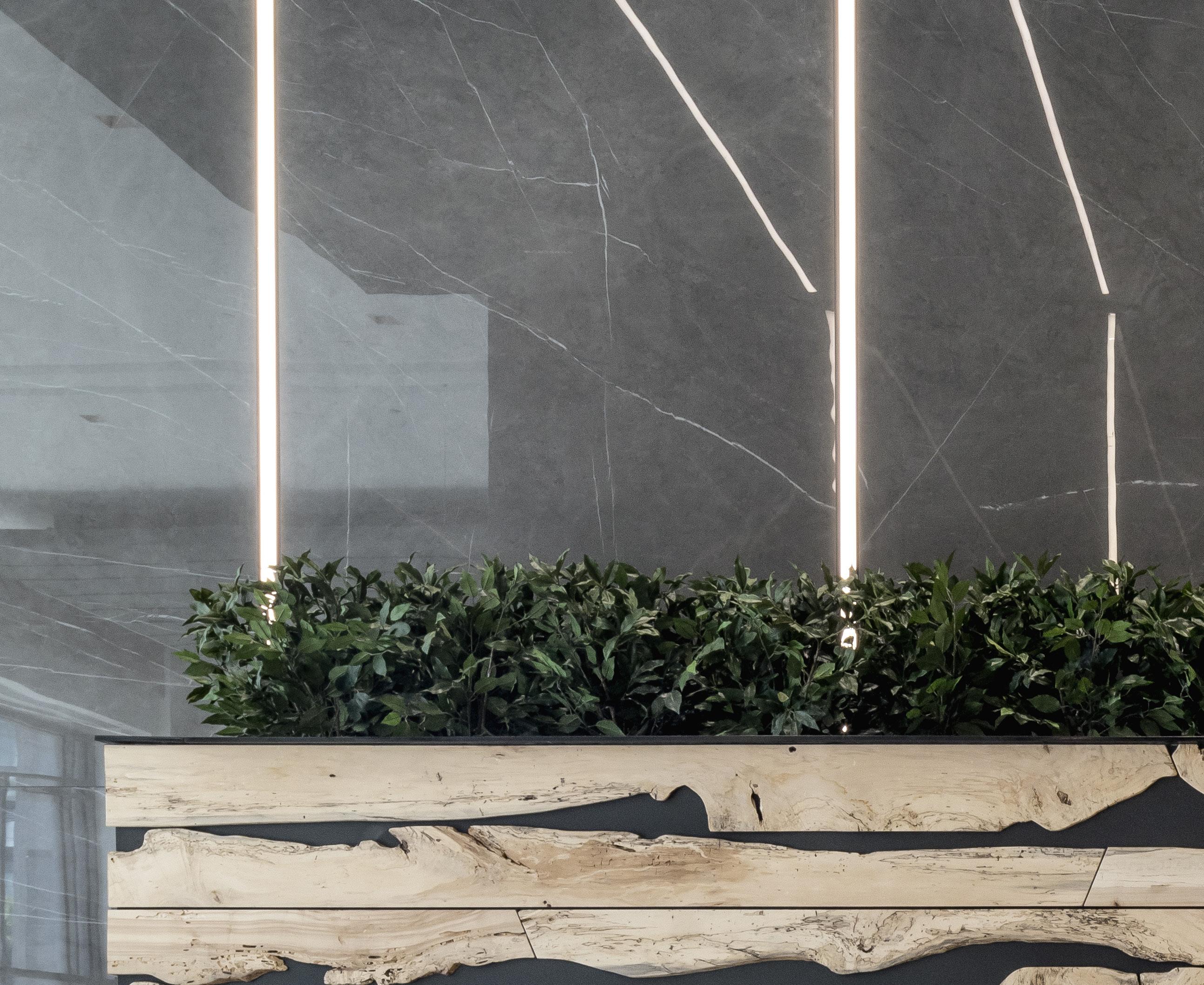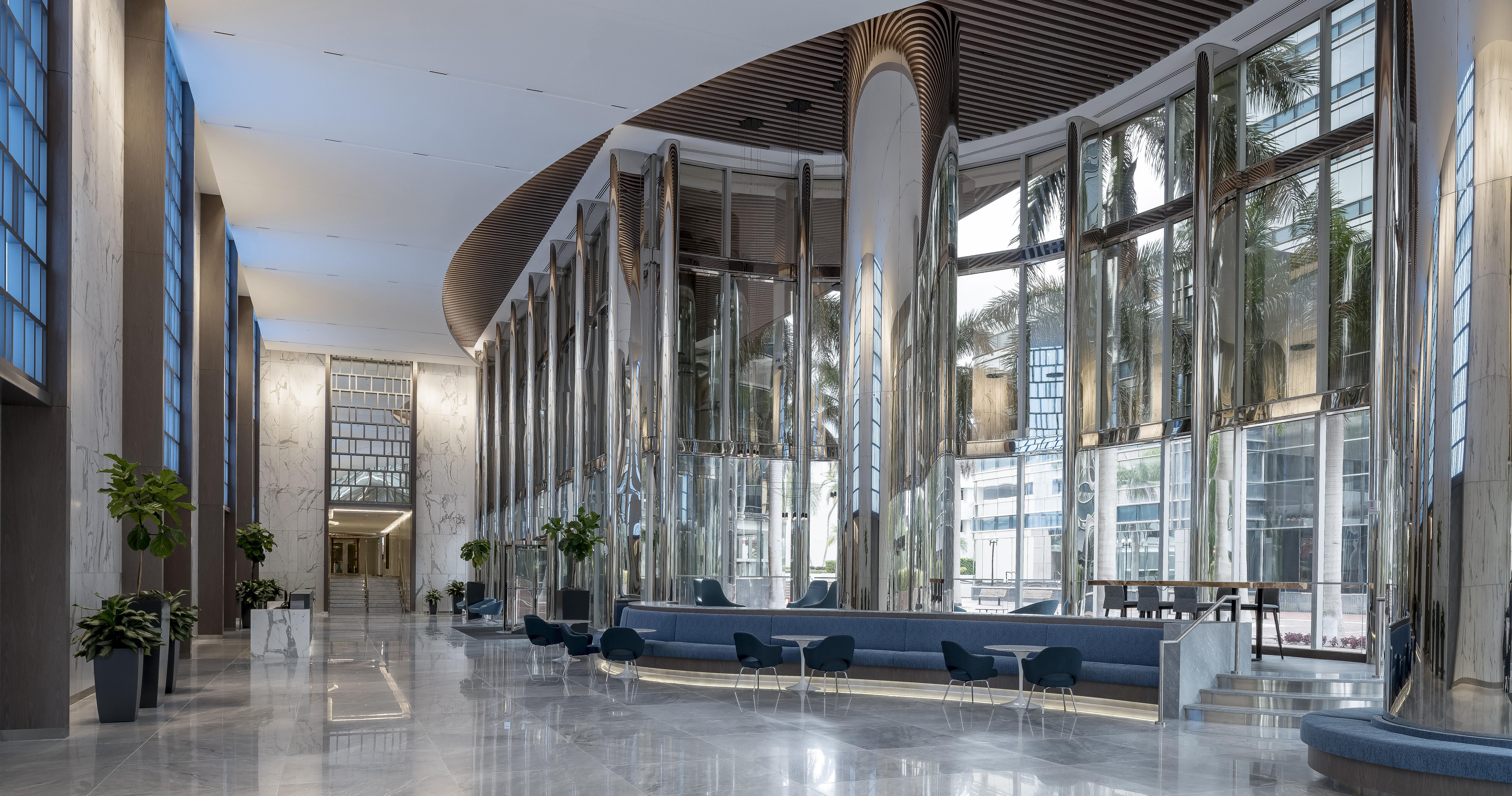 The goal of the new lobby design was to simplify and soften. Several aspects of the original space were kept, such as green marble stone, some of the architectural forms and use of glazing systems, preserving the integrity of the building. The new added materials and finishes amplify existing elements. This was achieved through the use of quality finishes that are refreshing to the space.