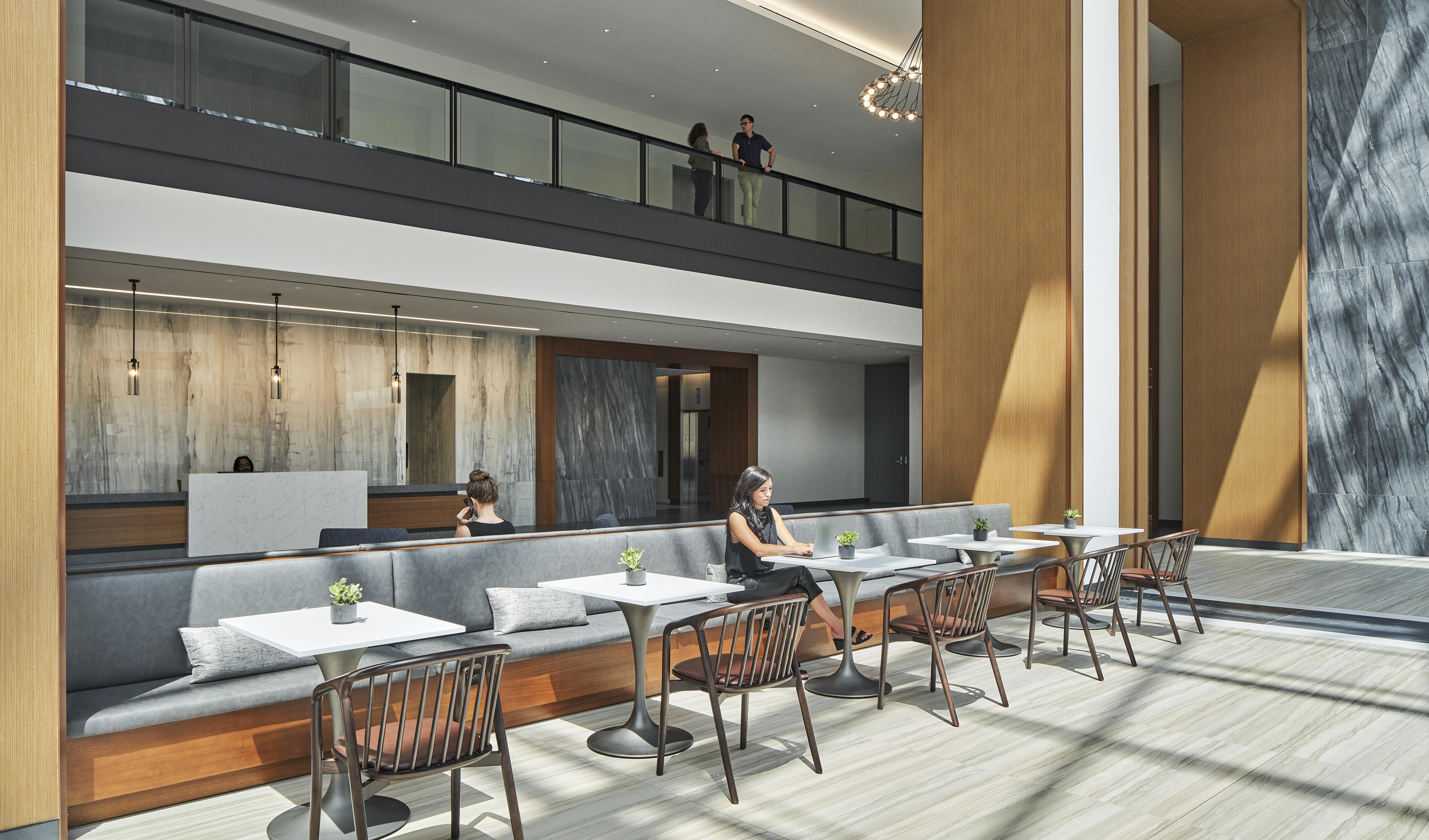 The scope of work dramatically embraced the large volume lobby by converting the central stair hall to a new gathering terraced seating environment with wood clad planter feature repurposed from trees previously taken from the site. The entirety of the ground floor was changed from a simple passage to elevators, to a grand social gathering area with variety of options supported by a coffee shop, café bistro along with a new expanded fitness center. A new amenity conference center and wellness area was also added on the third floor.