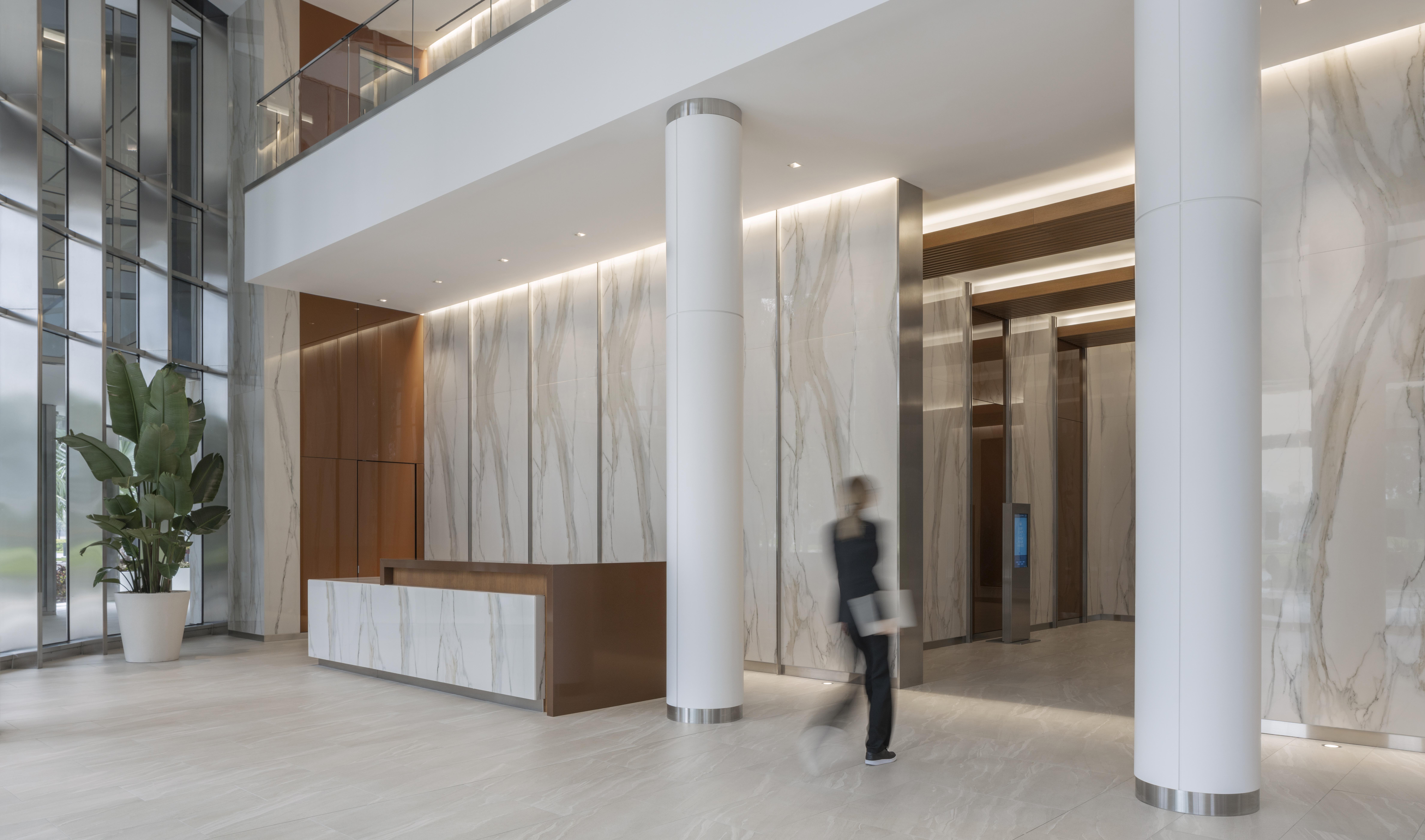 The new design represents a dramatic transformation into a modern fresh and bright interior fully visible from the exterior with particularly dramatic evening views. The entry façade received new broad radial cast stone steps. The former black granite bulkhead fascia was removed and replaced with beautiful black marble effect thin polished porcelain tile large format panels to create a proscenium effect framing the lobby opening. New taller, sleek stainless-steel column covers supporting a radiused stainless steel soffit and brow replaced the former glass reinforced concrete ornamental columns opening the view to both levels of the lobby. The new interior was significantly altered to create a very simplified solution that promoted the grandness of the open two levels. The bowfront balcony was removed to provide for a long span white bulkhead with clear glass handrail. The lobby of former stone and wood wainscot was replaced with white Calcutta marble effect porcelain tile that extends vertically across both levels of the lobby façade. Each five foot wide panel of tile is divided with stainless steel bar reveals with uplighting from the floor as well as wall grazing lighting above. The new walls are complemented by wood colored back painted glass, wood ribbed millwork in the elevator lobby ceiling and new light-colored porcelain tile flooring that flows throughout both levels as well as through to the exterior of the entry plaza. New slender column covers in white Corian further highlight the two-story space with a refined elegance. With a complement of new reception desk, furnishings, and artwork the Two Town Center property now showcases as if it were a new building.