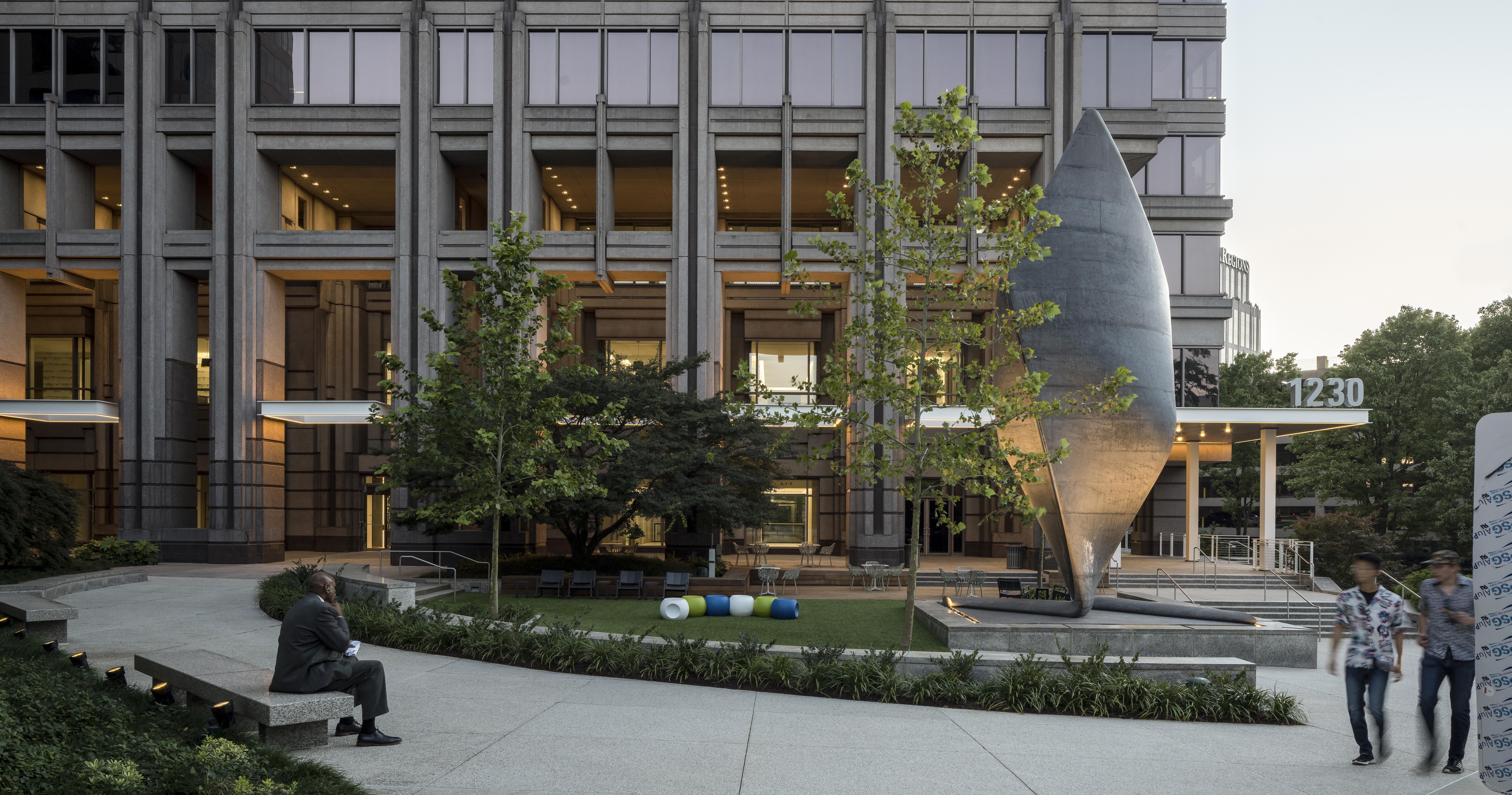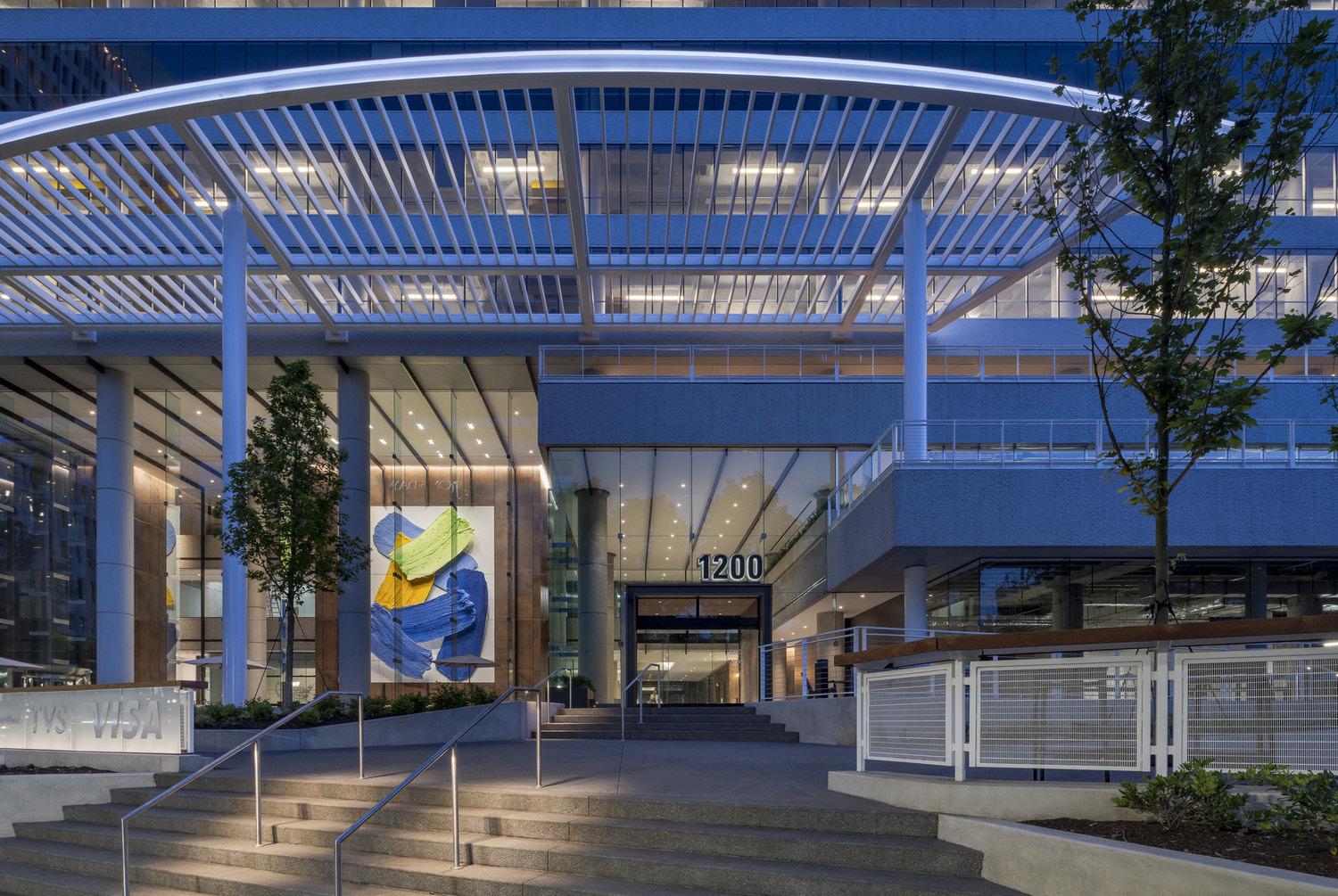 The updated exterior plaza boasts all new lawn space, variety of seating groups and landscaping that is cheerful and green while still allowing for wide open vistas throughout. Building visitors now enjoy a bright and modern focus to the entrance by the new architectural portal.
