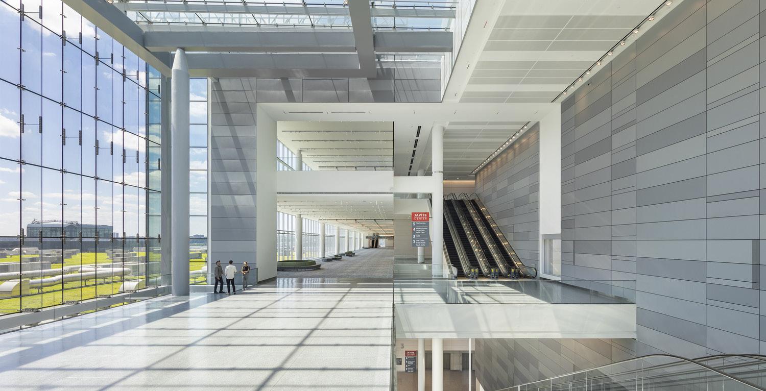 New entry plazas and arrival zones with monumental facades will greet visitors arriving from the north and east. New registration lobbies serving the expanded exhibition space will be located adjacent to the entry plazas. The new ballroom will be placed on the third floor directly above the northernmost new exhibit hall. It will have prefunction space along the north and east side. A large roof terrace providing views to the city will be adjacent to the east prefunction. The new meeting rooms will be located on levels one and two along the new extension of the east concourse. The new parking garage has five levels and will be placed directly above the exhibit loading area.