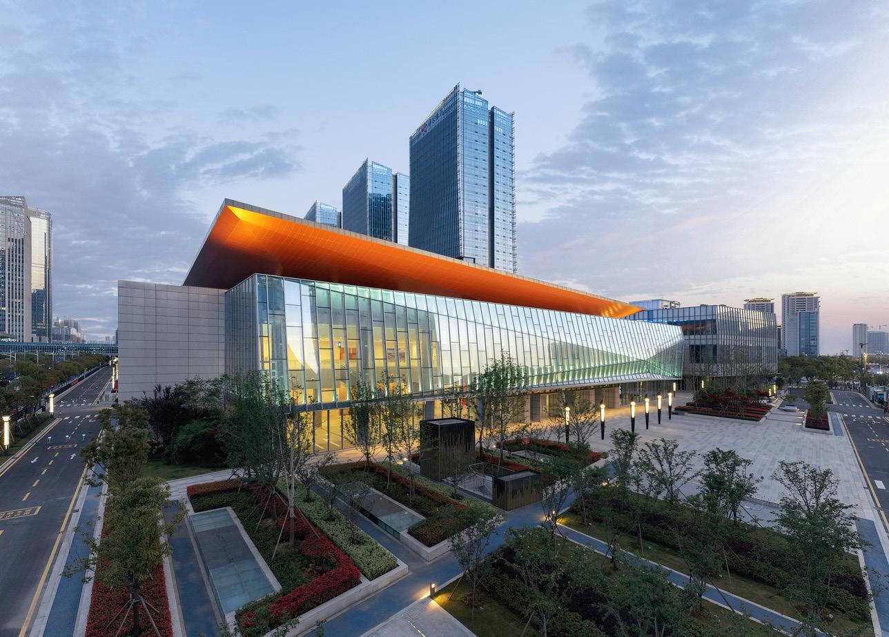 The primary components of the exhibition center are the exhibit halls for temporary exhibit events; the support and circulation spaces associated with them; the merchandise mart, a multifloor structure with showroom space for permanent exhibits; an outdoor exhibit plaza; an opening ceremony plaza on the south side; and underground parking with 3,500 spaces.