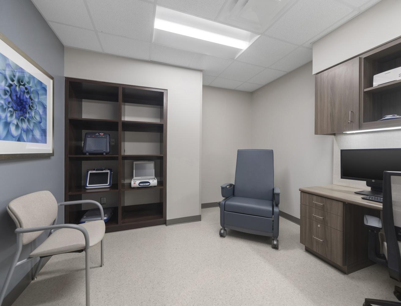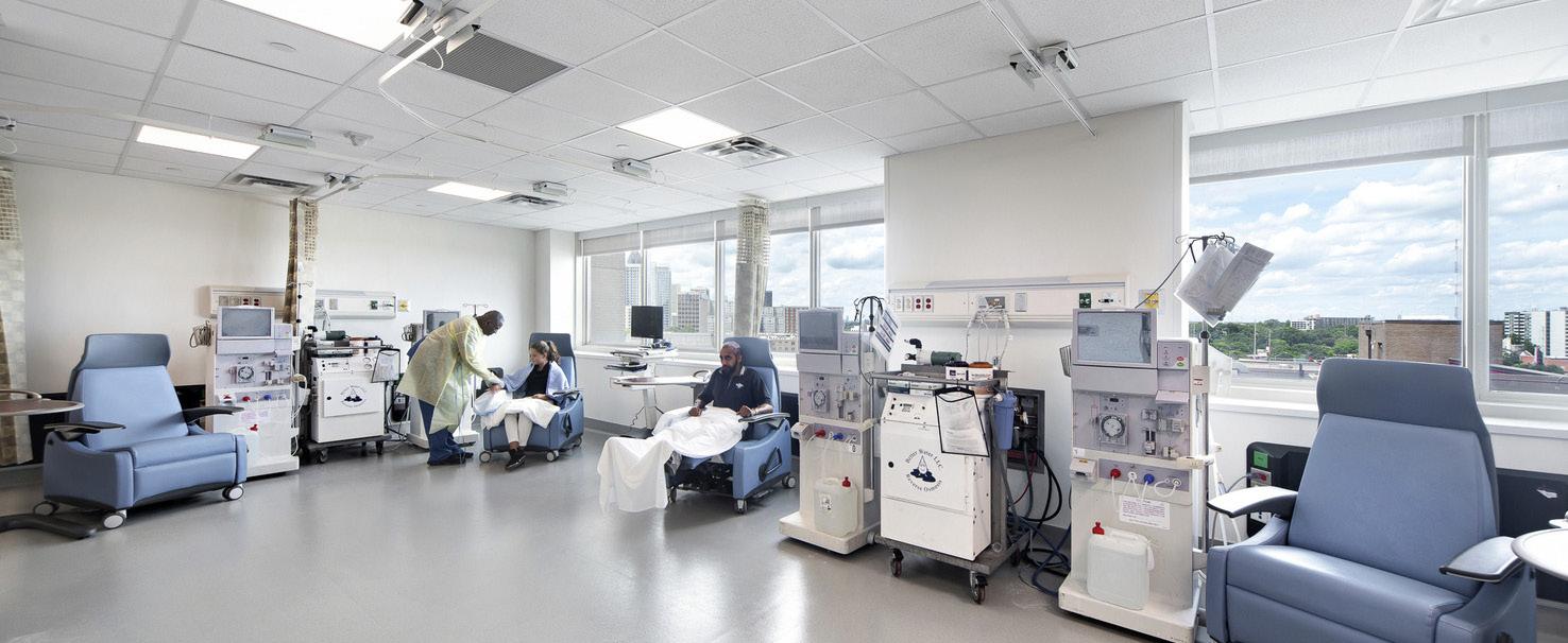 The design team provided full-service architectural and interior design. The space originally located on level nine serves inpatient and outpatients undergoing regular dialysis treatments. The new suite improvements include a change in occupancy, new infrastructure, 18 dialysis bays, an isolation room outfitted to support a dialysis patient, a waiting area and several support spaces including dialysate prep room, storage, nourishment, and offices.