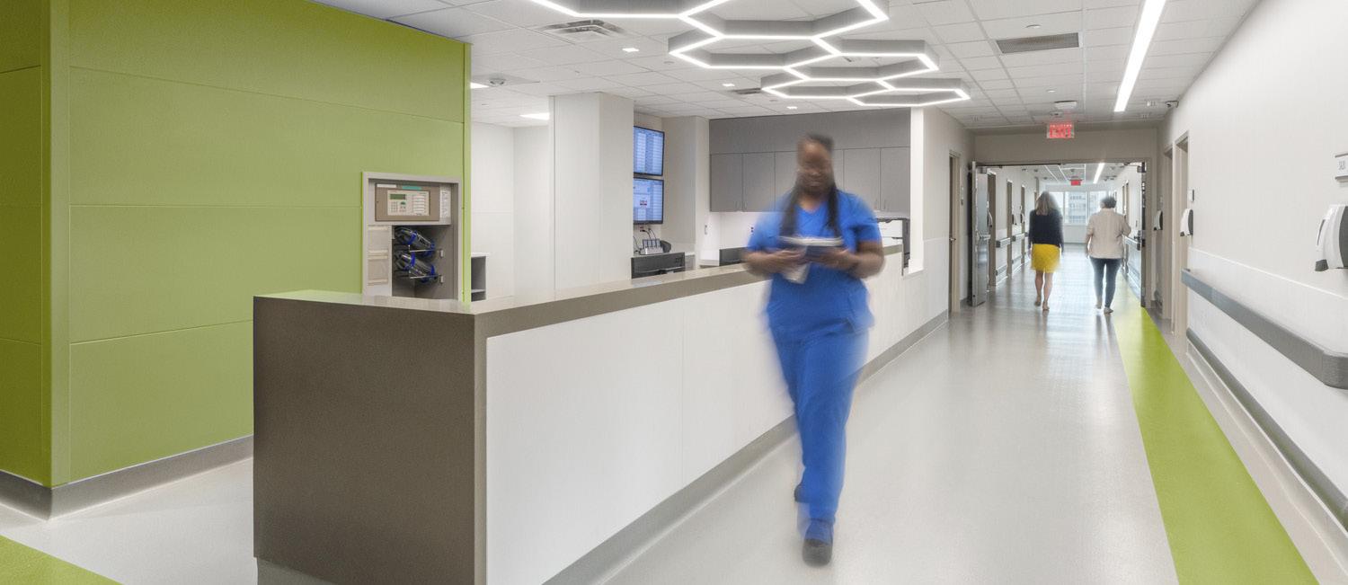 The floors, which were last redesigned over 30 years ago, received over eight inches of standing water from the flood needed to be demolished entirely and brought up to code. Working with two construction partners, the team had seven months to have these spaces fully operational. To add another unprecedented layer of complexity, the COVID-19 swept through. The team maneuvered through the challenges of multiple partners, a compressed schedule and changing pandemic-era guidelines (not to mention increased bed need) to begin opening this project in early August 2020.