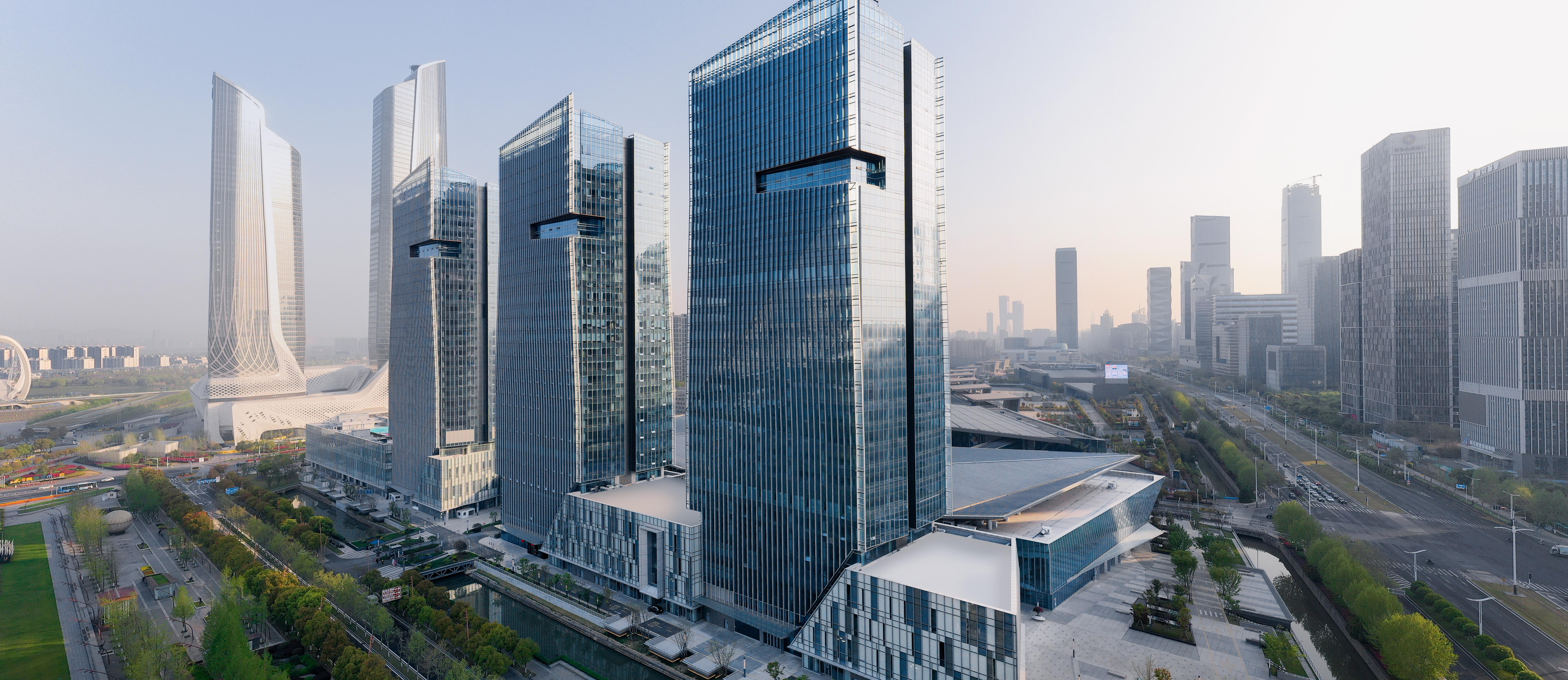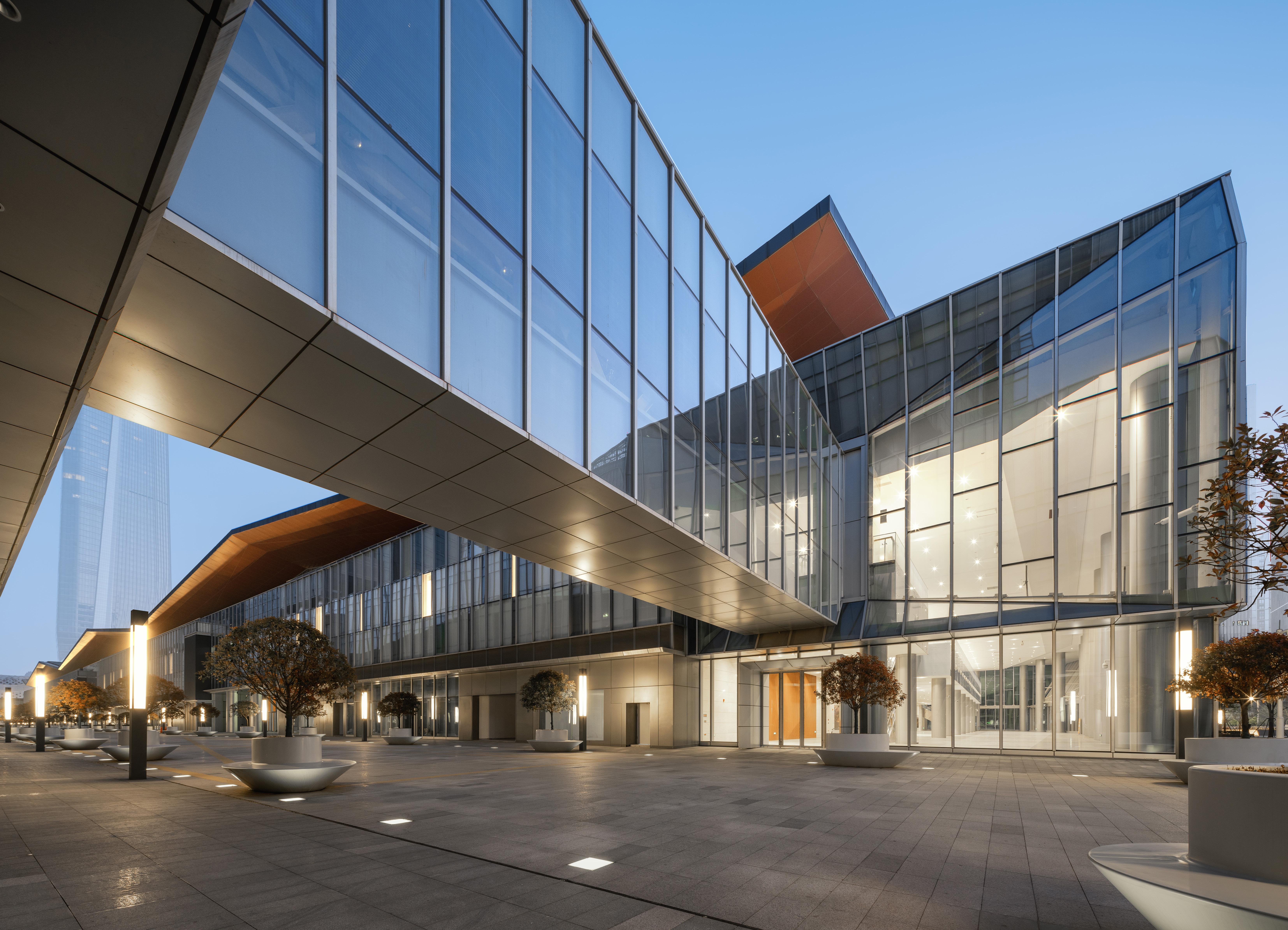 Separated from the exhibition hall by a pedestrian laneway are three high rise office/hotel towers atop a podium with 21,200 sm of retail and entertainment venues. Phase III boasts a 400 meter long pedestrian laneway between the exhibition hall and south podium that realizes an urban design goal for the greater Hexi District of a comprehensive system of separate, dedicated pedestrian environments. The laneway provides a dynamic offering of retail and entertainment venues in service to exhibition attendees and residents of Hexi.