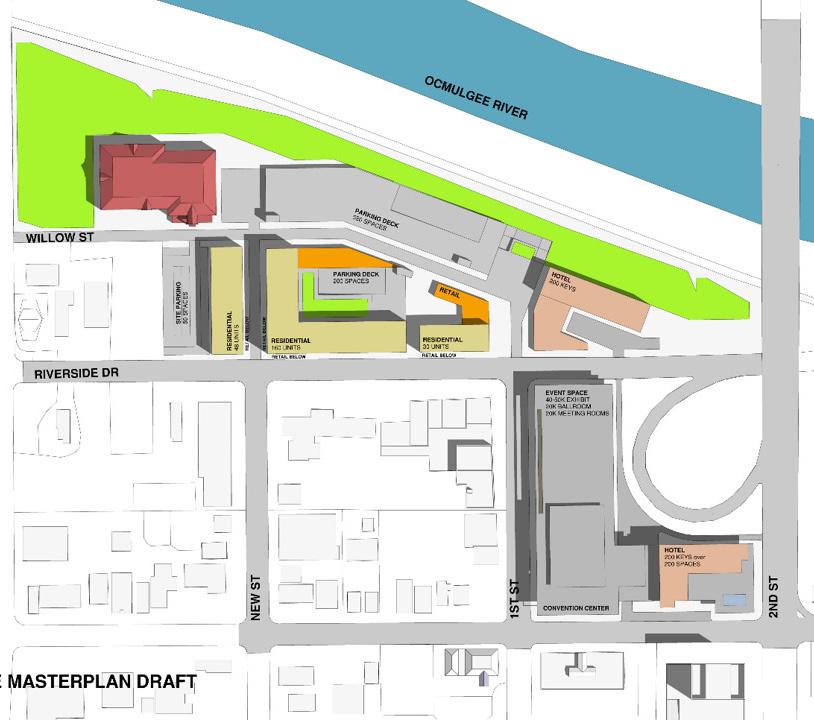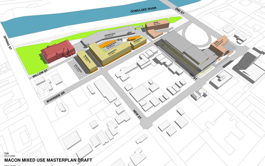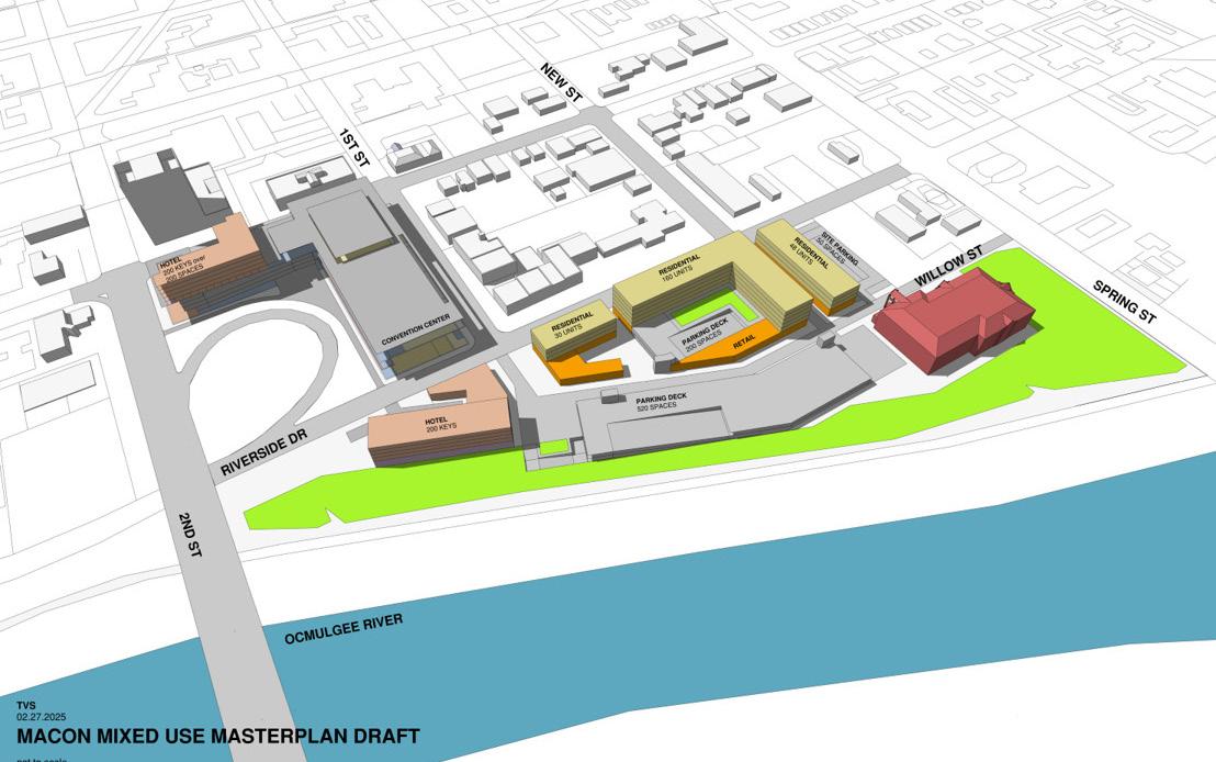 This master plan is a straightforward eastern extension of downtown Macon. The concept places low to moderately scaled buildings along the street edges and corners. The well-rounded mix of uses – convention, hotel, education, retail, and residential – repositions this edge district into a live/ work/convene/learn destination, visible from both the heart of Macon’s downtown and Interstate 16.