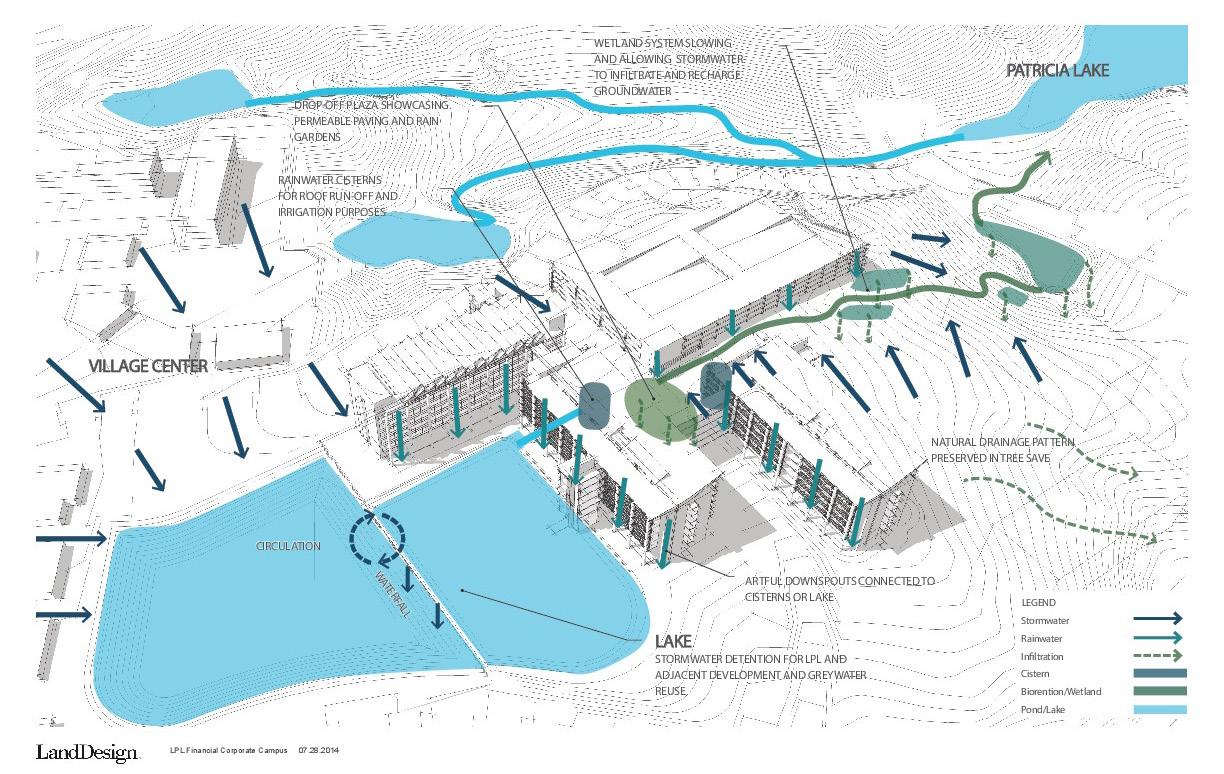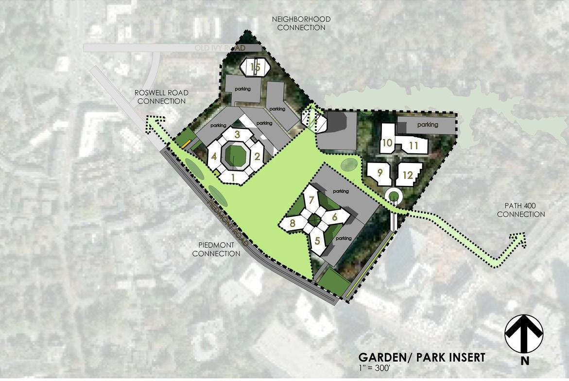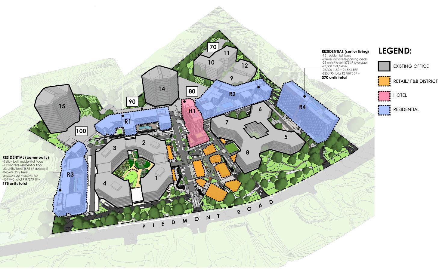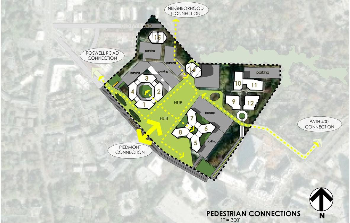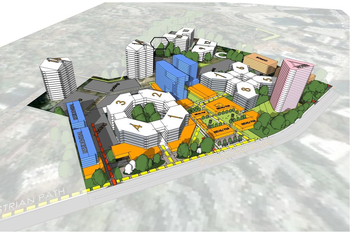 The retail village at Piedmont Center was designed to unlock the potential of a 45-acre site office park surrounded by surface and structured parking. TVS’ job was to guide a transformation to reposition the traditional office park experience into a thriving mixeduse center. Focusing on the fragmented, disparate nature of the existing buildings, TVS proposed a design solution that will begin to stitch together the campus in a way that created synergies among the uses.