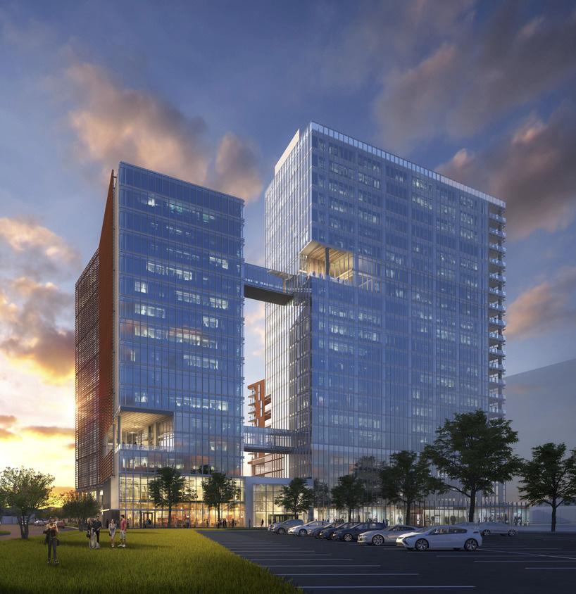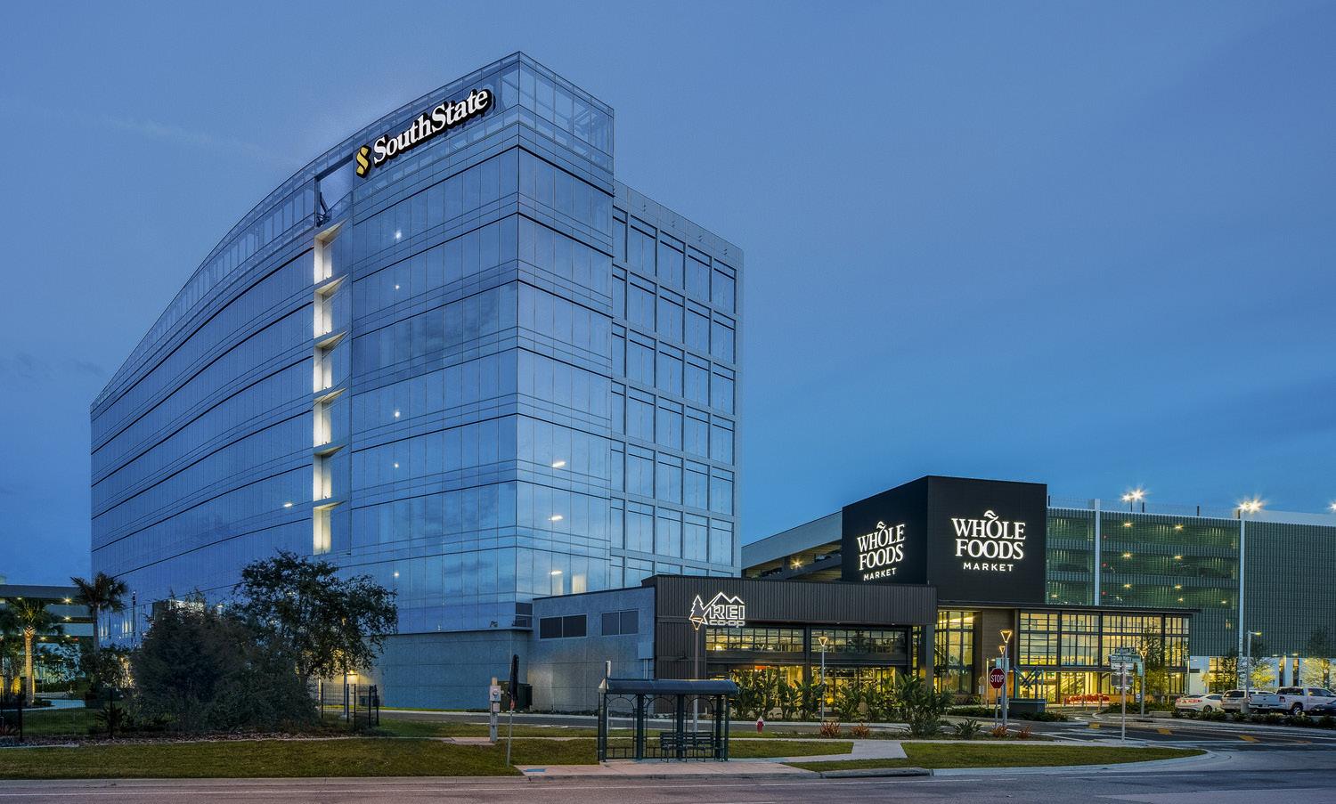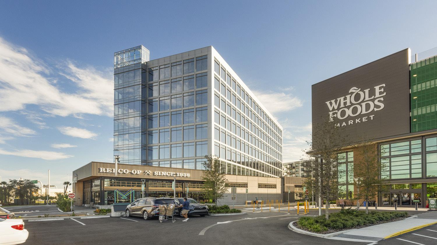The West Tower is located adjacent to I-275 as well as the lakeside park, and is surrounded by outdoor gathering spaces that create an iconic entry to this new mixed-use development. The office tower provides both public and private access to the building with an elevated walkway from the main parking deck directly into the office tower, but also accommodates ride-share drop offs and retail activity on the ground level.