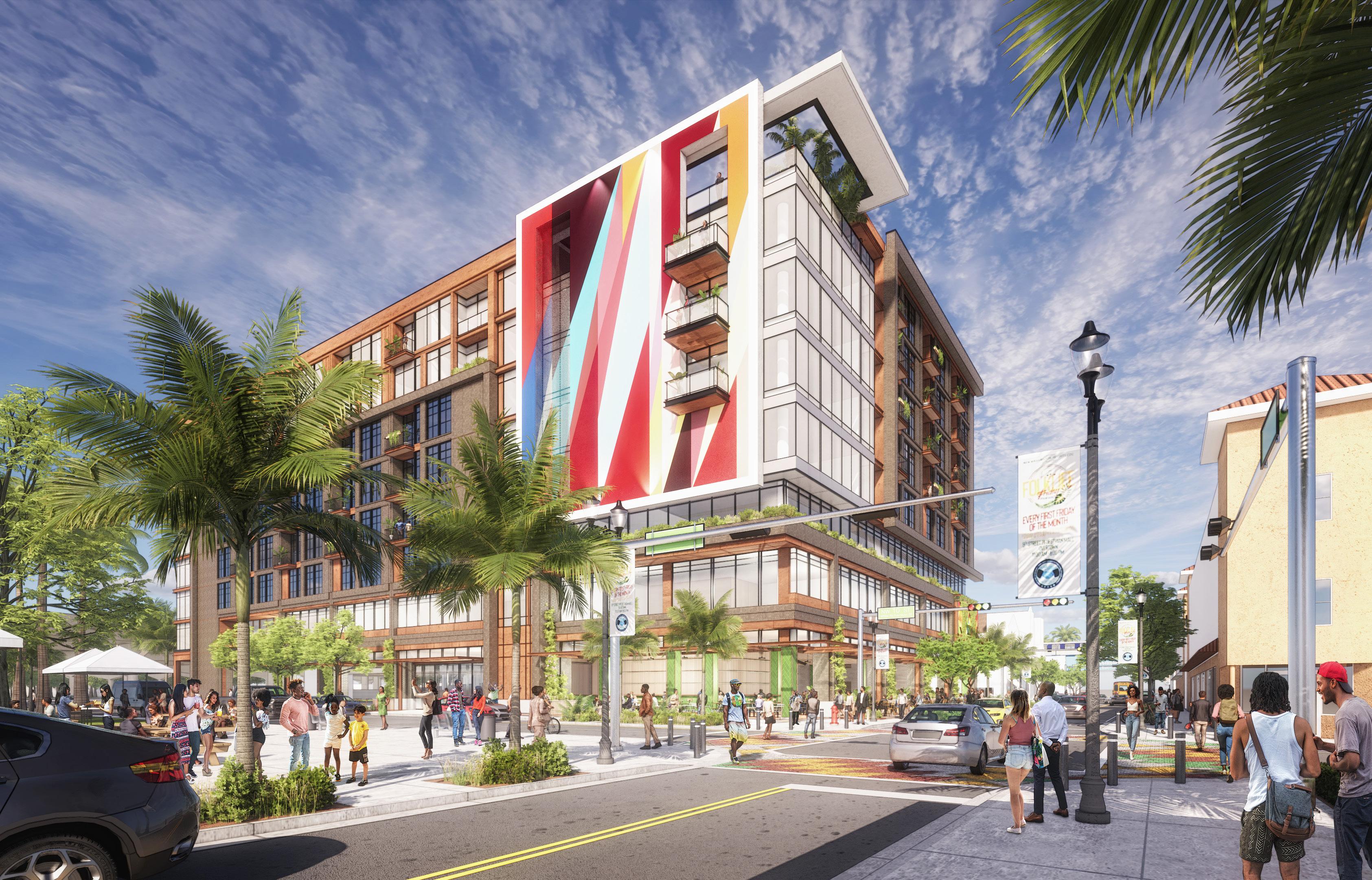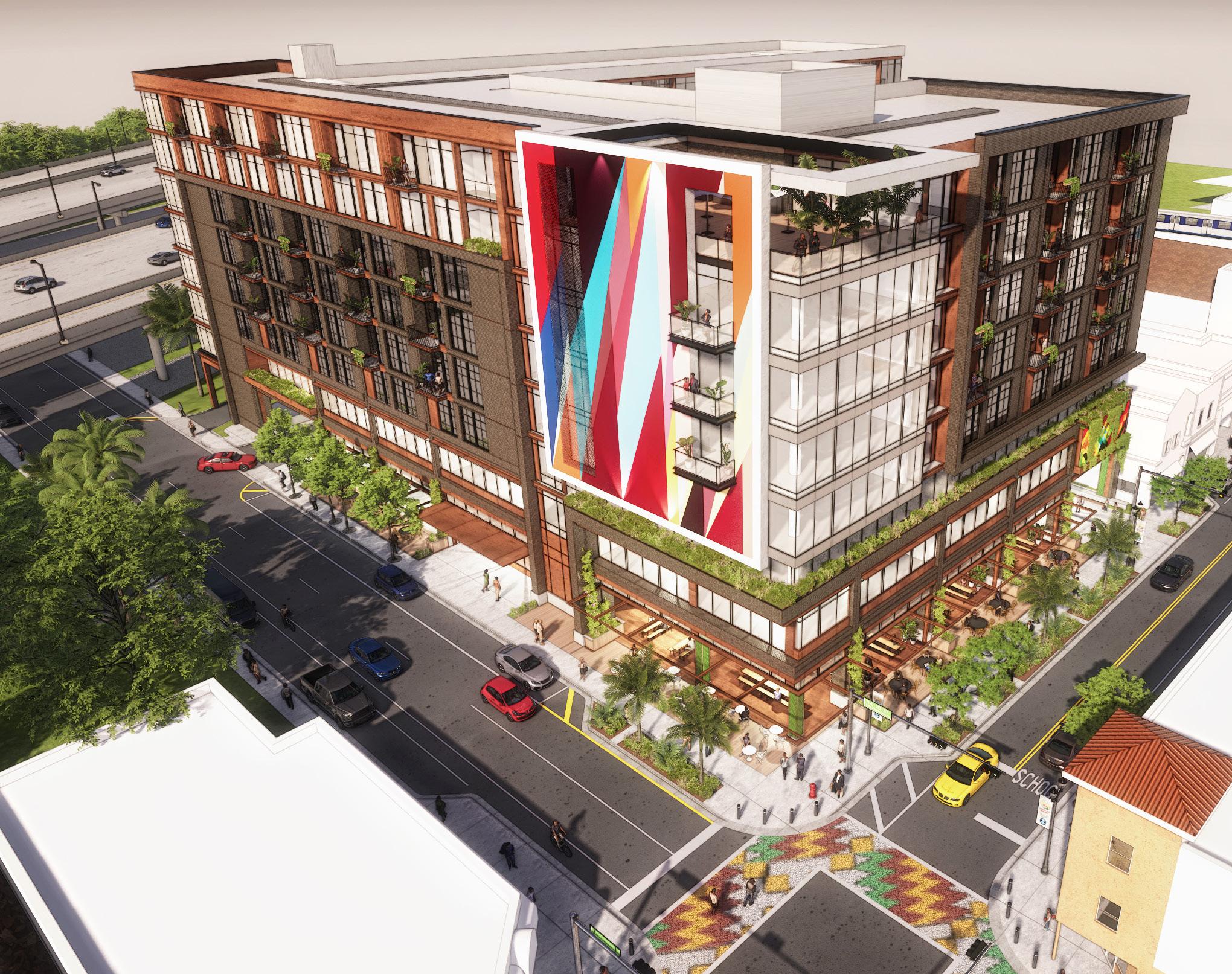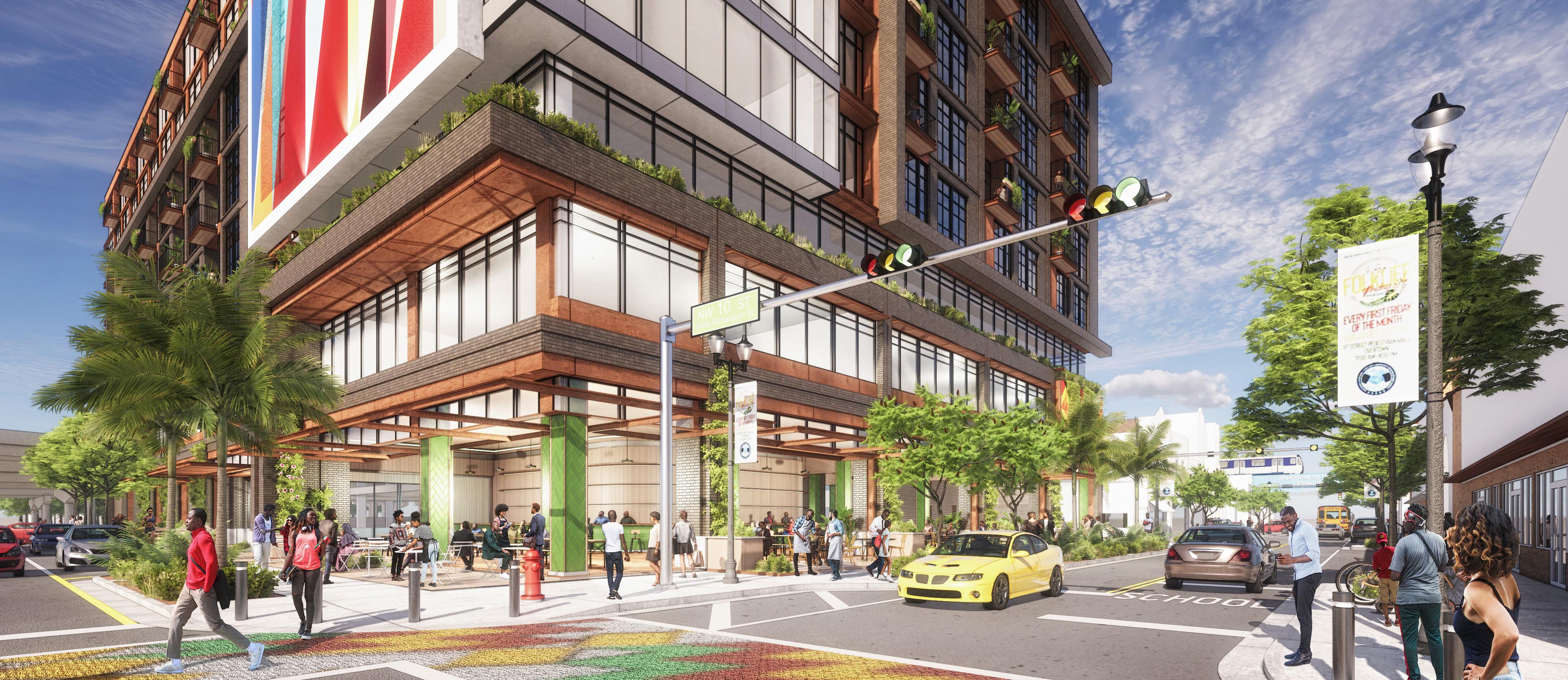 Located adjacent to the Culmer metro station, the building’s shape is obliquely bent to maximize its extent across the site and create a connection to the transit station. The west end becomes defined by the sharp corner and parallel street frontage to NW 8th Street Rd while the east end steps and offsets orthogonally. Setbacks at either end of the building push the upper floors inward creating the opportunity for rooftop amenity spaces.