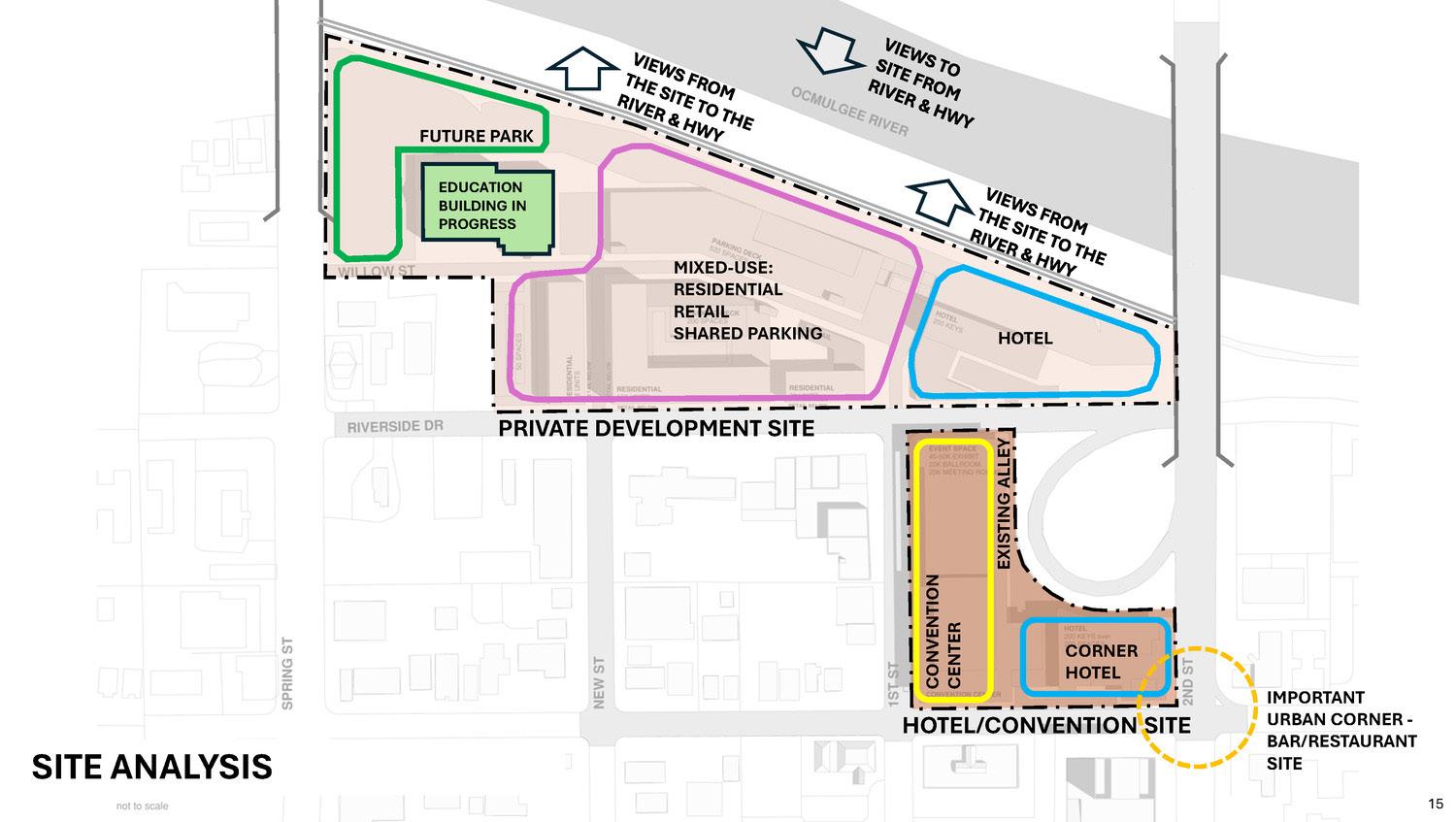 This study aimed to provide a test-fit and sample visualization of what could occur on the site. This study is the first step in determining viability and is in advance of surveying, engineering, zoning, and other more detailed analysis. This master plan explores a Benton sized convention center paired with 400 new hotel rooms. While site area and scale preference a hotel configuration split between two buildings, a second option placing all 400 rooms in one hotel is doable.