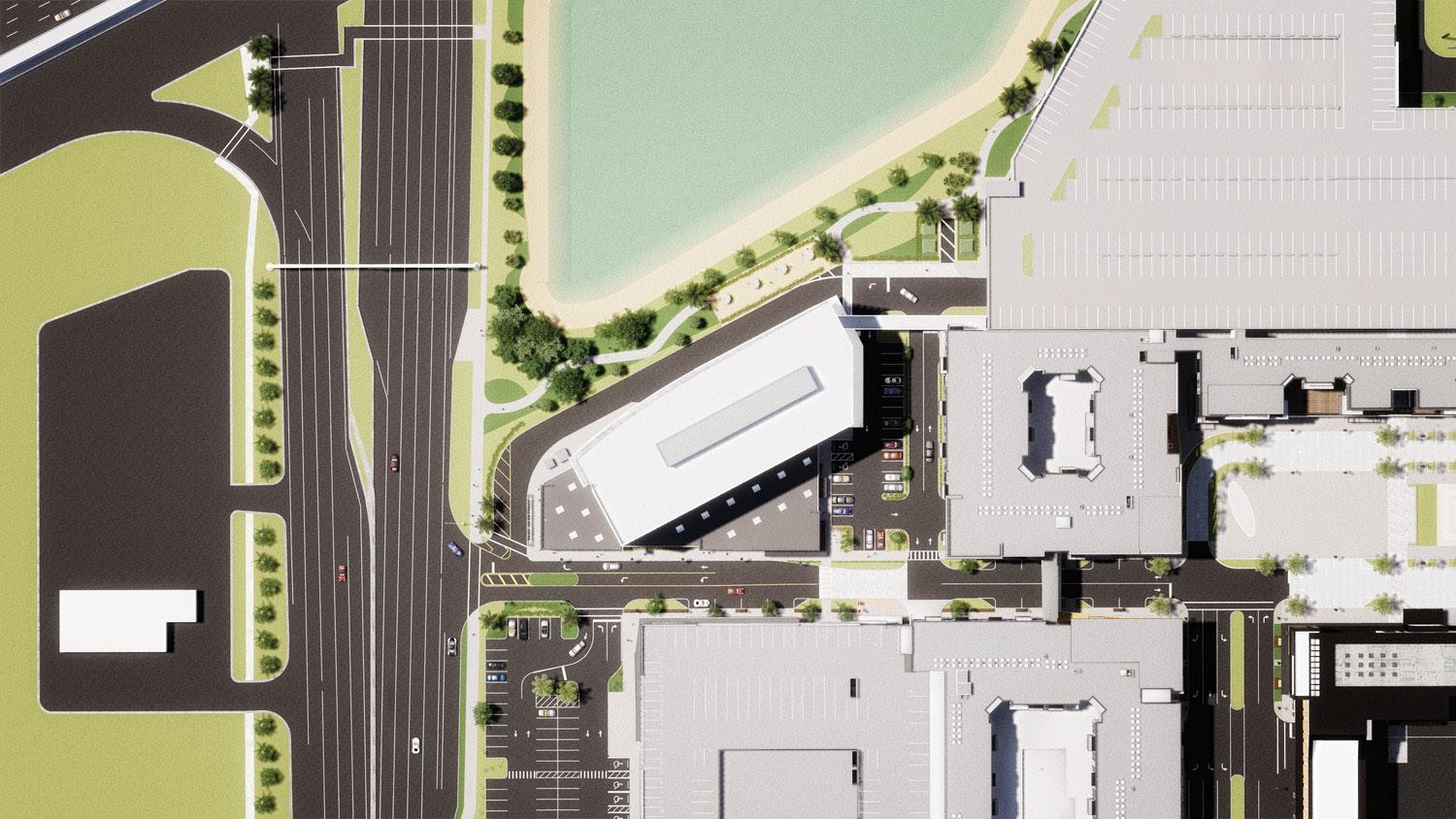 The initial master plan for the Atrium Health Amphitheater also includes sites for future retail, restaurant, hotel, and park/festival space. The amphitheater is intended to be a catalyst for the redevelopment of Macon Mall, taking advantage of underutilized parking while revitalizing a static section of suburban Macon, Georgia.