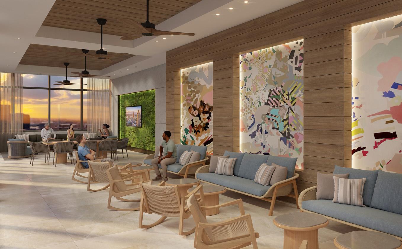 A third accent wraps the parking podium on four sides as a perforated screen wall. Dynamic in form and vibrant in color, this porous façade brings movement to the ground plane as it frames street level retail economic opportunity and ground-level gathering spaces. As it transitions to the main entry, the screen wall blends into a feature art wall of the multi-height lobby.