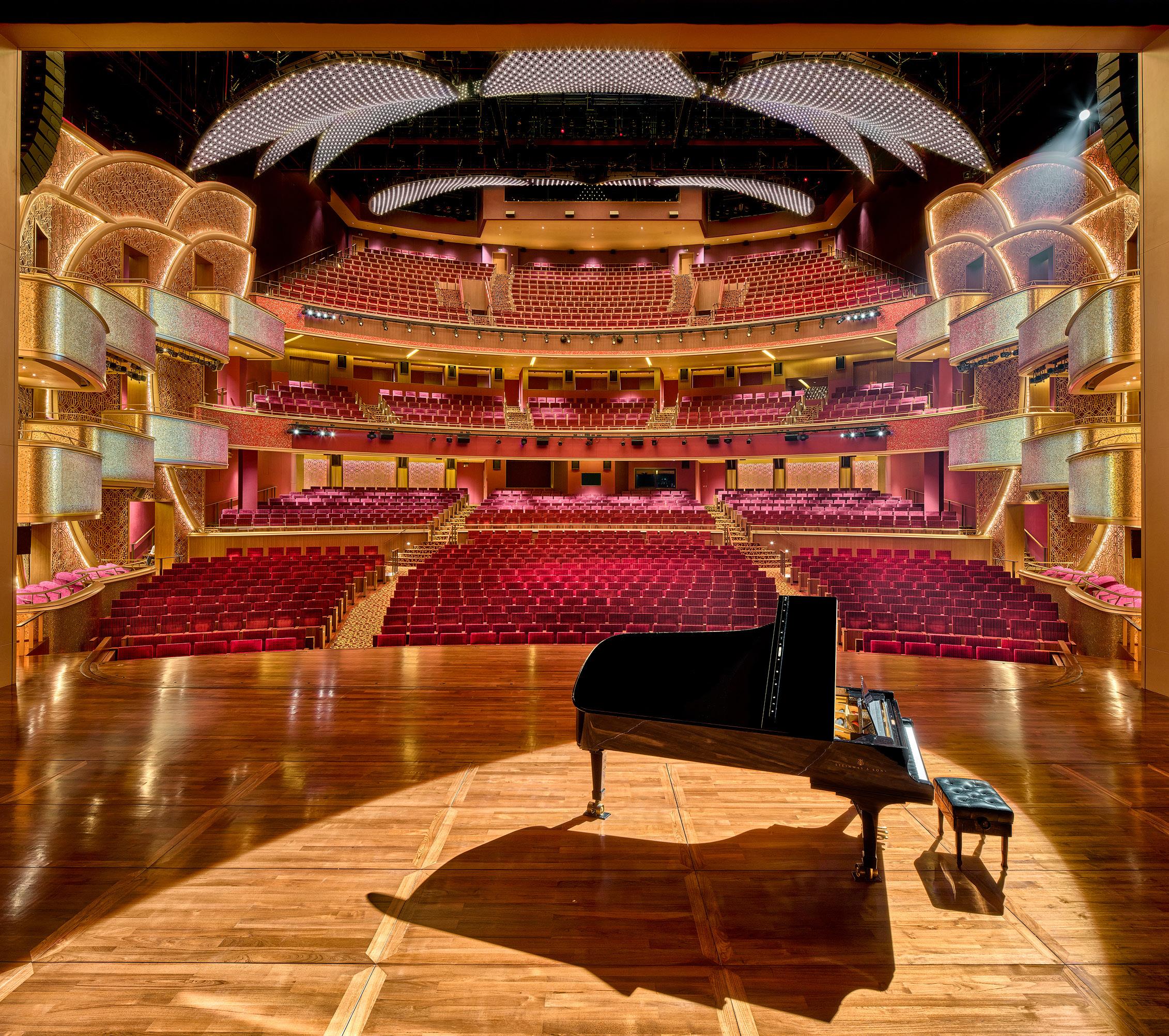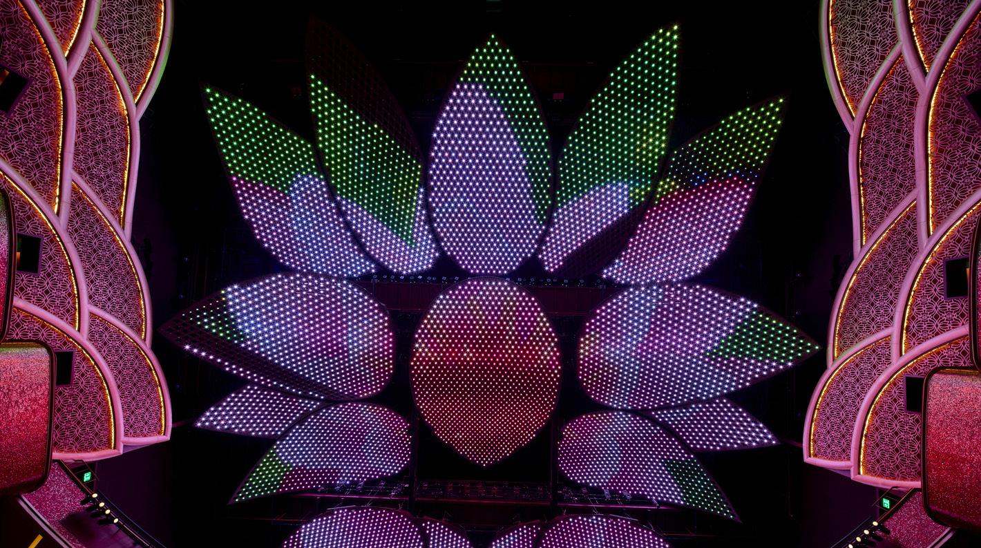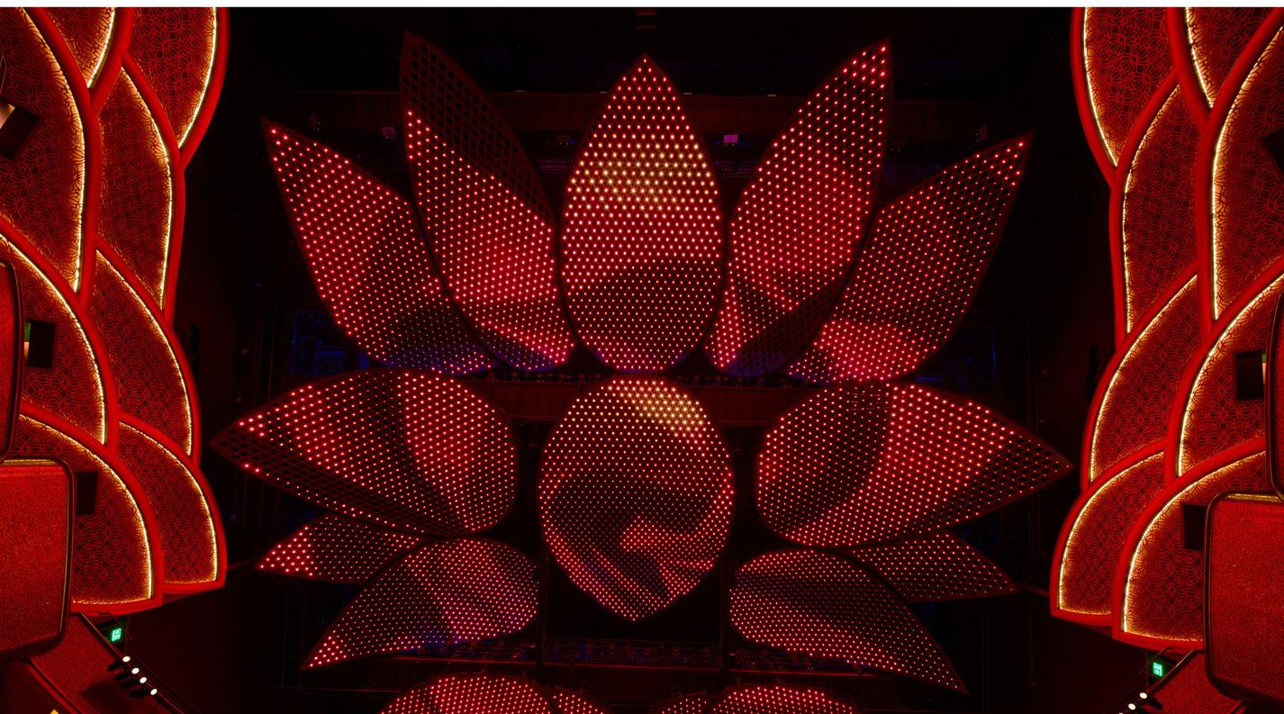 The stand-out feature of this world-class hall is the bespoke ceiling. Custom-built in Austria, 17 lotus petals with arabesque perforated pattern studded with 8,400 Swarovski crystals individually programmable and illuminated transform this remarkable ceiling into a theatrical performance element by itself. Its ability to change in color and pattern integrated into theatre events make this unique in the world.