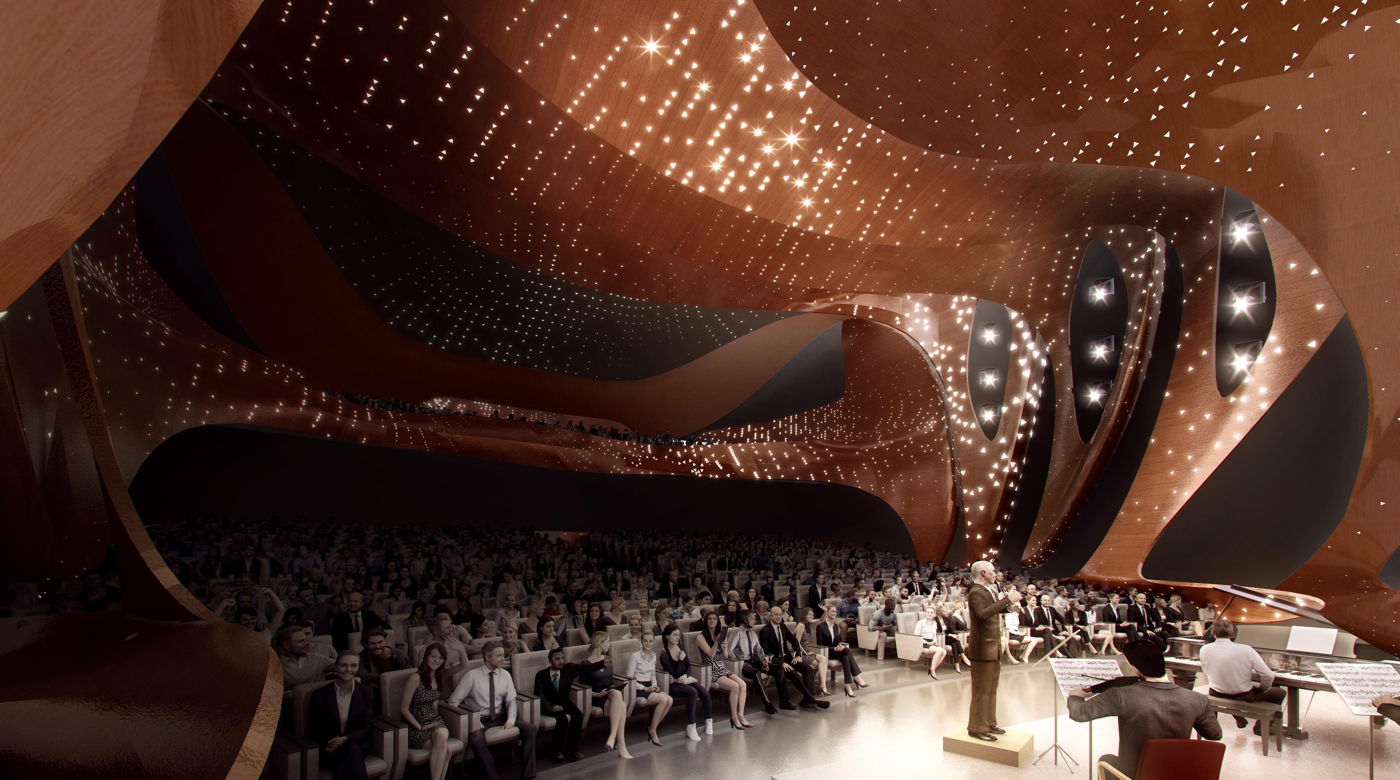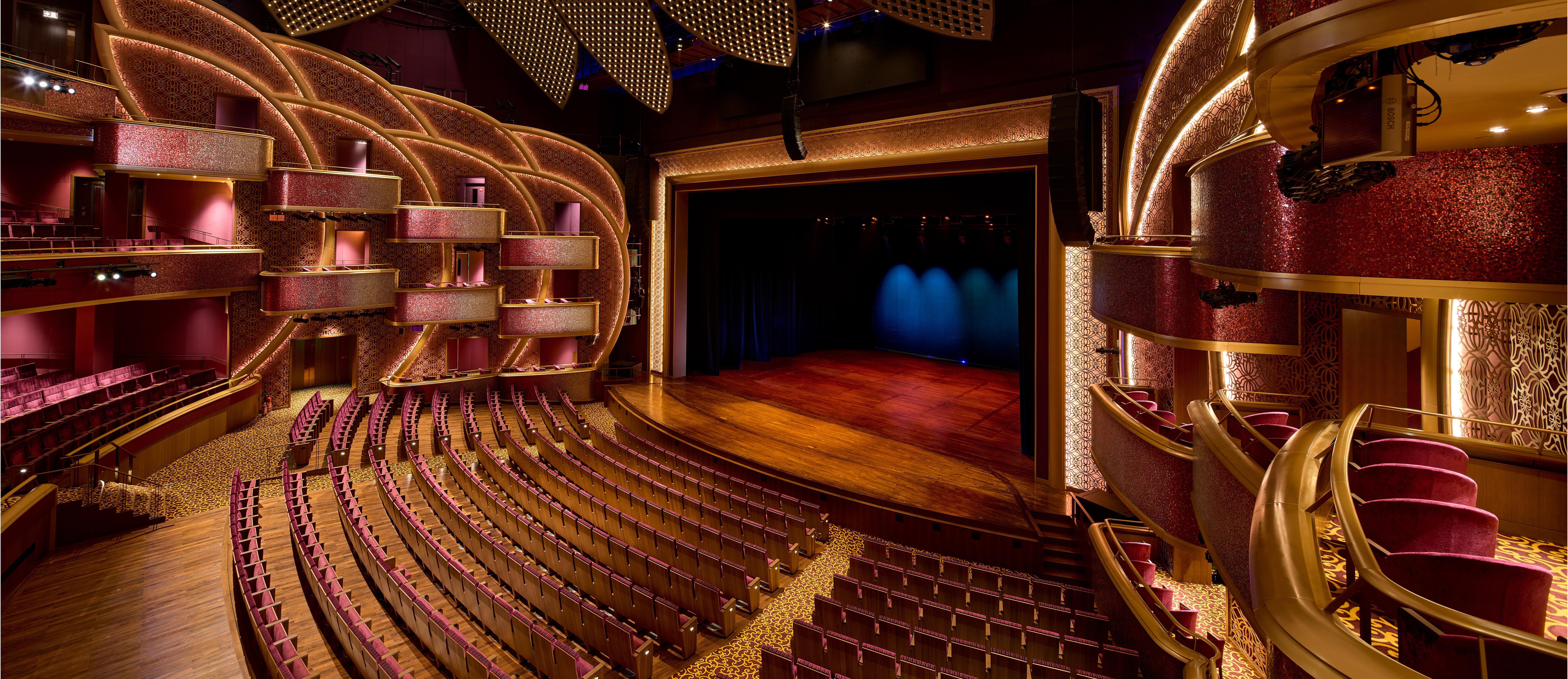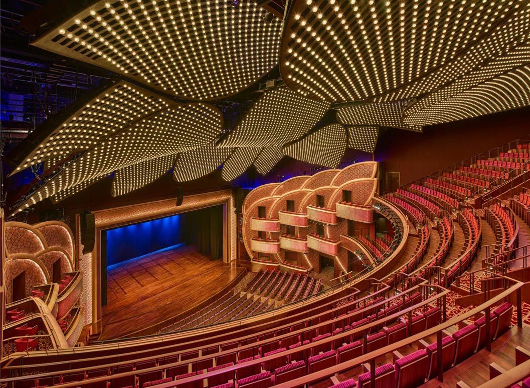 The stand-out feature of this world-class hall is the bespoke ceiling. Custom-built in Austria, 17 lotus petals with arabesque perforated pattern studded with 8,400 Swarovski crystals individually programmable and illuminated transform this remarkable ceiling into a theatrical performance element by itself. Its ability to change in color and pattern integrated into theatre events make this unique in the world.