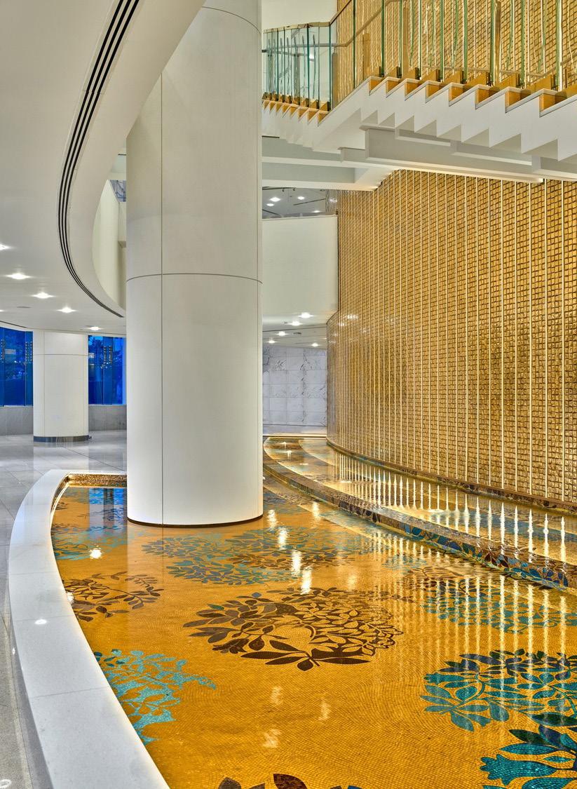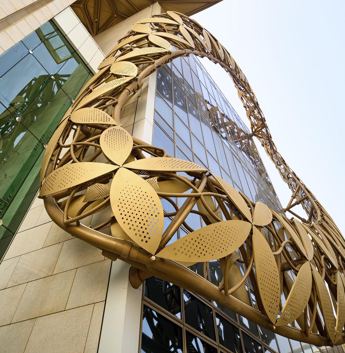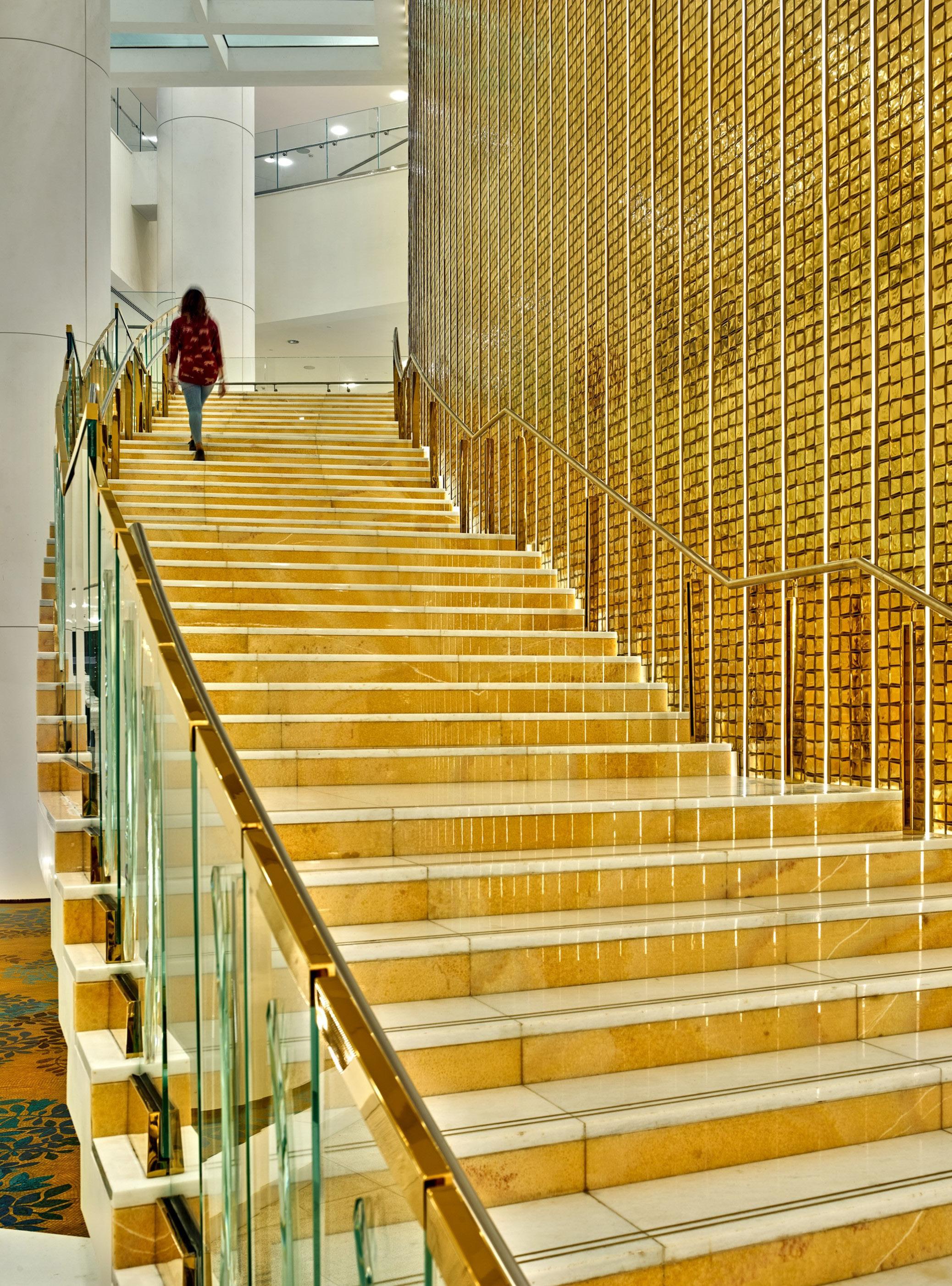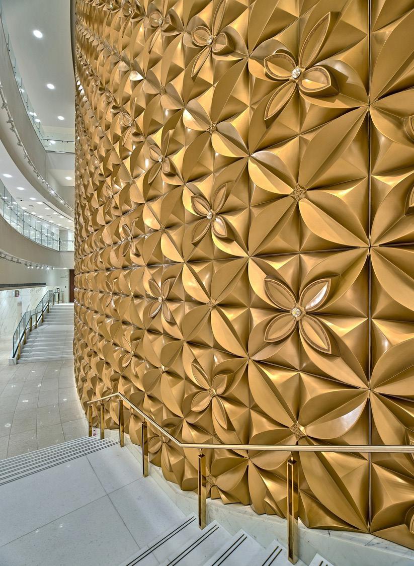 The Grand Theatre features exquisite jewel-toned Sicis mosaic glass tiles from Italy; customized laser-cut meta jaali screens from Dubai; acoustic micro-perforated walnut wood with the ability to absorb sound from Greece; handrails, door frames and millwork from Muscat; custom-colored fabric from Germany and walnut clad seating from Italy.