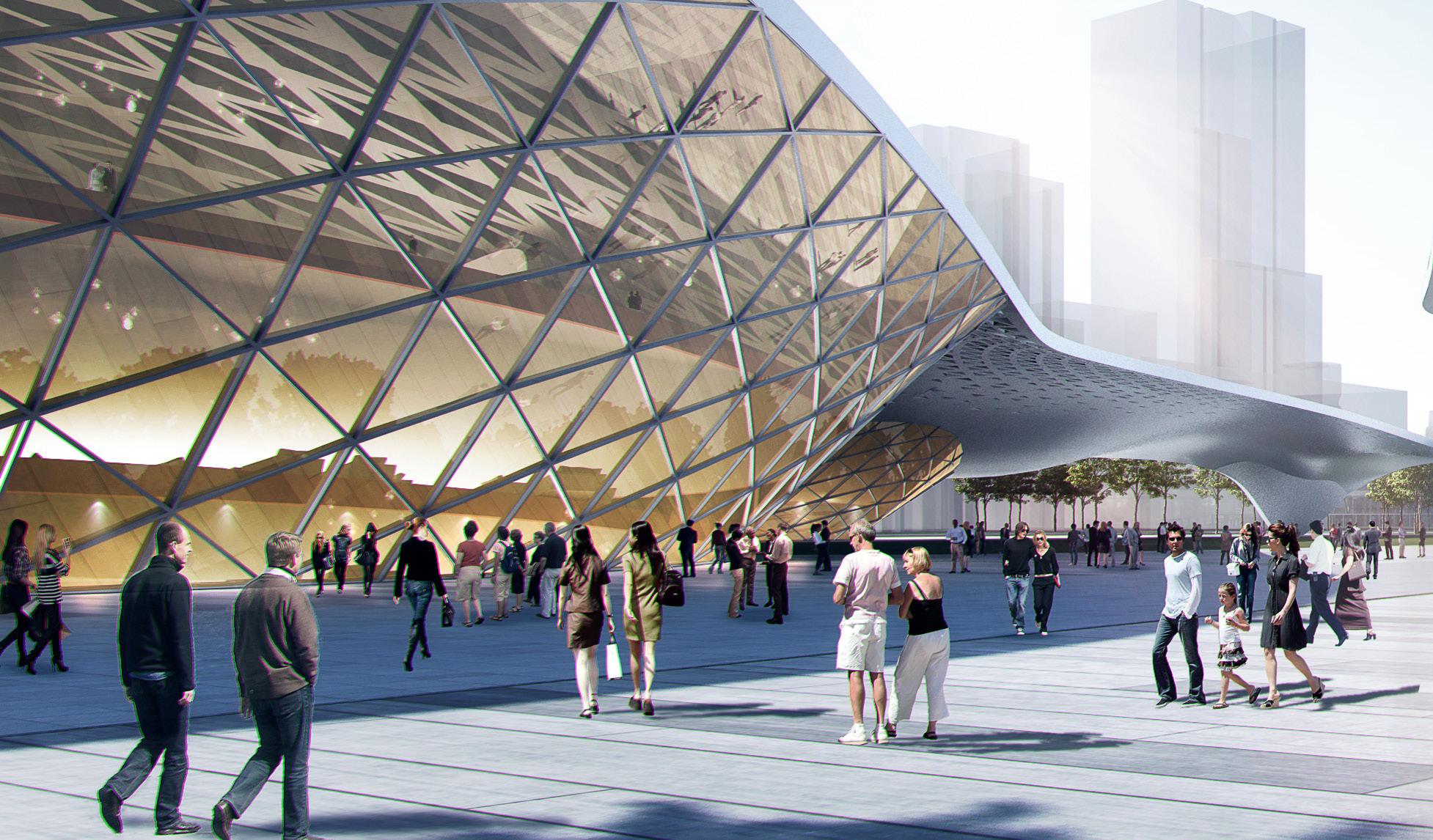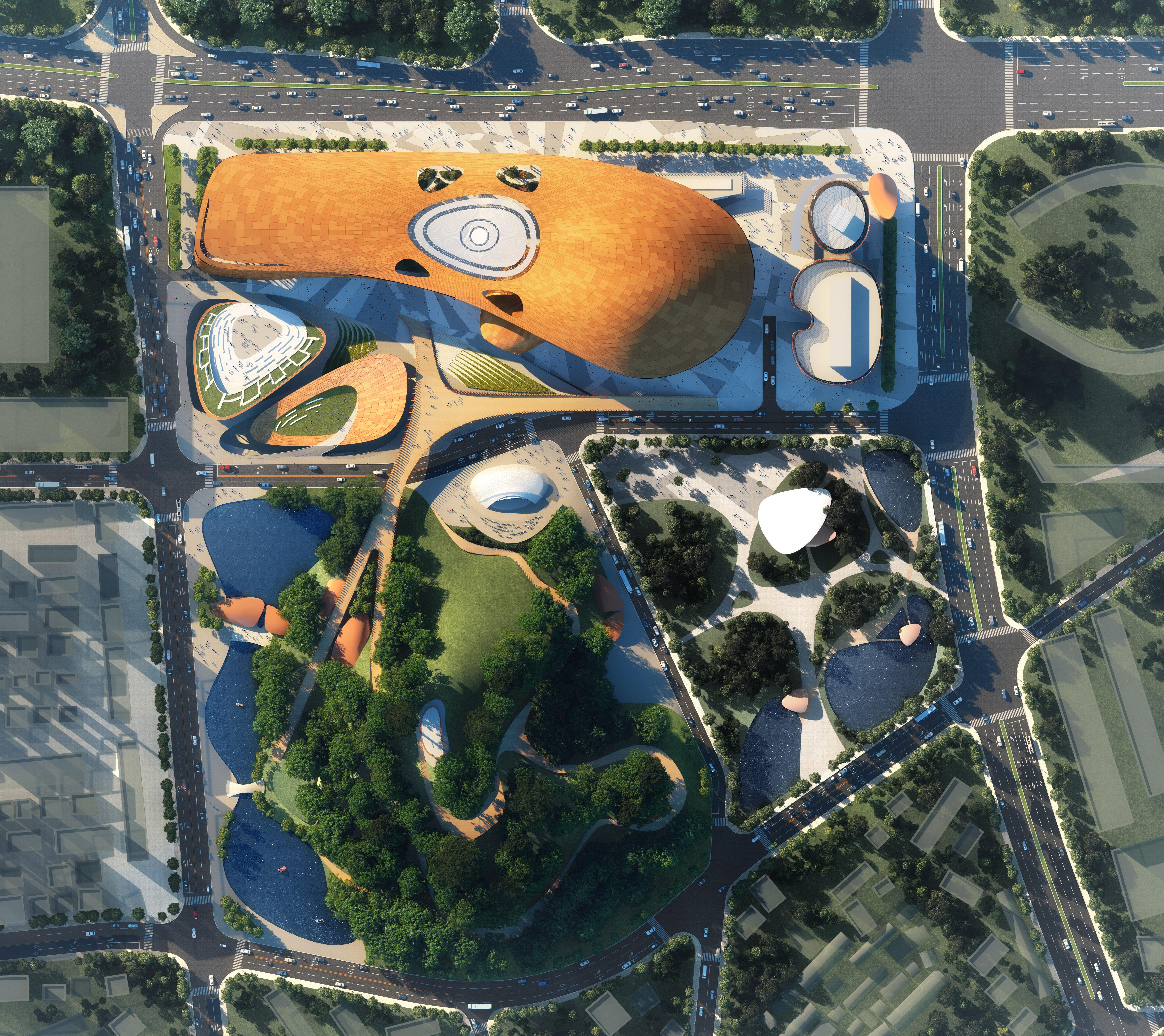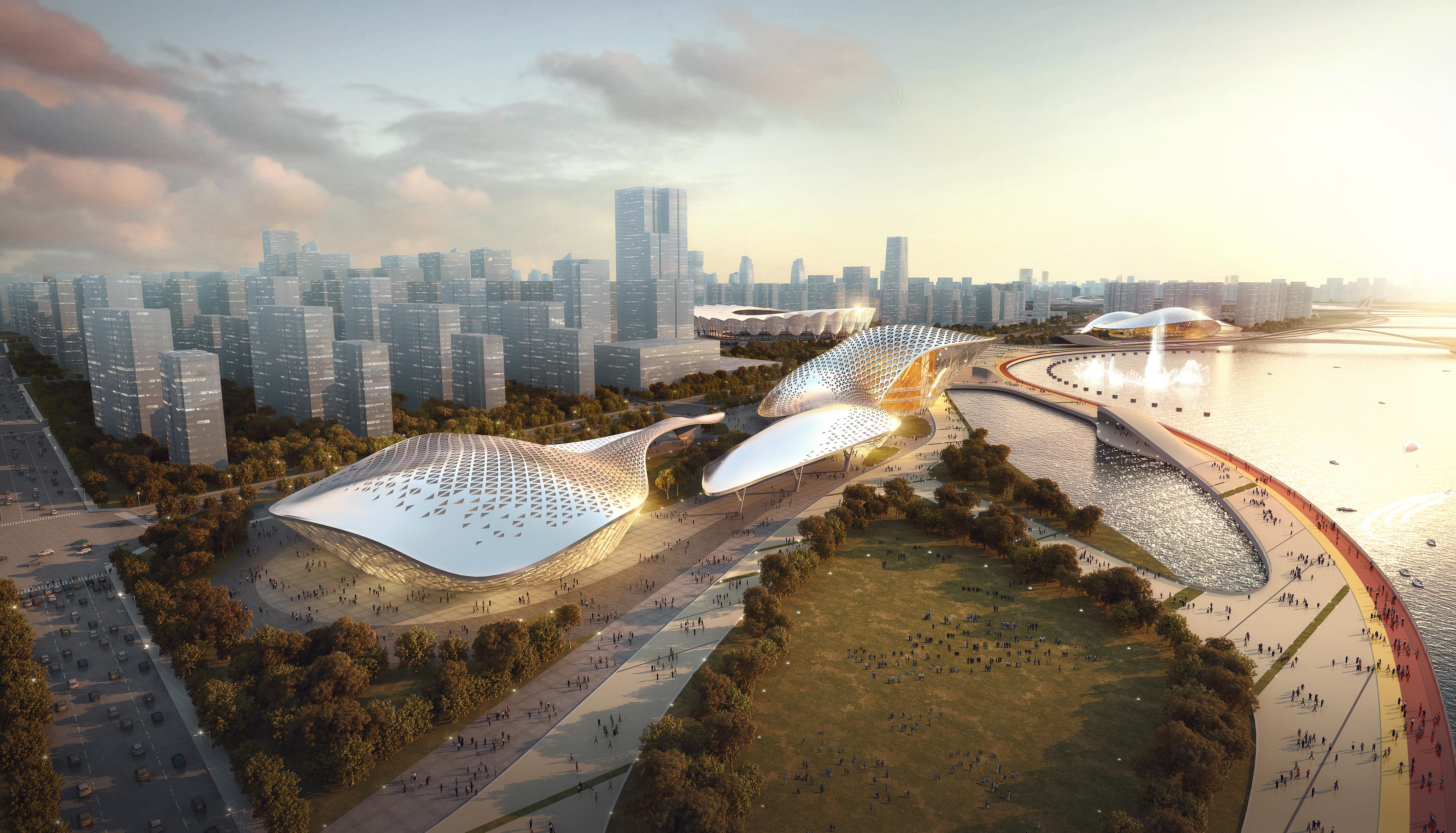 The Xian Chanba Ecological Park draws its inspiration from the twin representations in Chinese mythology of the Great Circle for the sky and the square for the earth. The sinuous architectural language of the park and its pavilions are also inspired by the Chinese concepts of unity and flow as they relate to both the river and the graceful movement and ennobling spirit of athletics. The park’s pavilions are arranged in four groups, with commercial mixed-use in the south, unity and flow pavilions in the center and a museum and library district in the north. The central unity and flow pavilions house the broadcast center, theatres, science museum, and youth center. The Xian Chanba Ecological Park envisions a dramatic transformation of the Ba riverfront for the enjoyment of the citizens of Xian and guests of the 2021 China National Games. The park features over 15 kilometers of riverfront jogging, bicycling, sports and recreational activities, boat docks and cafes.