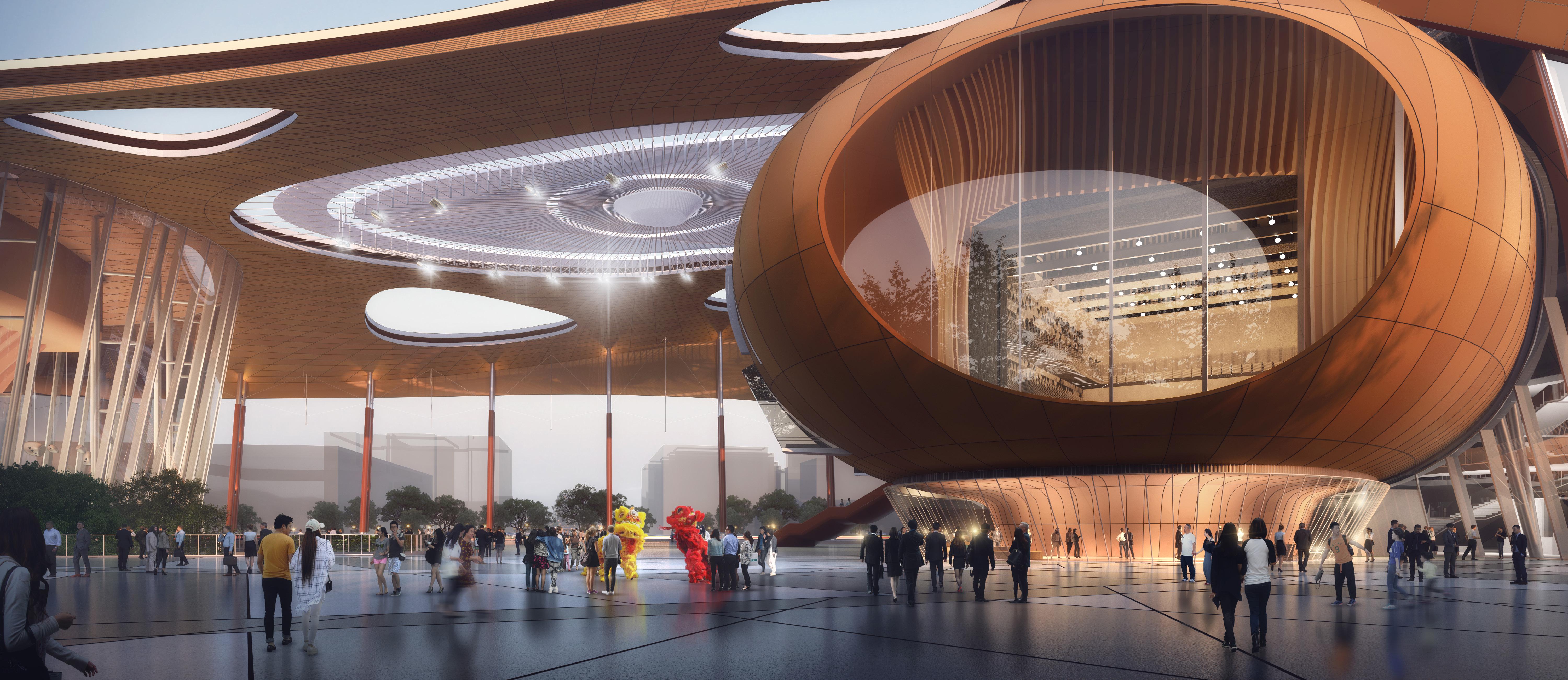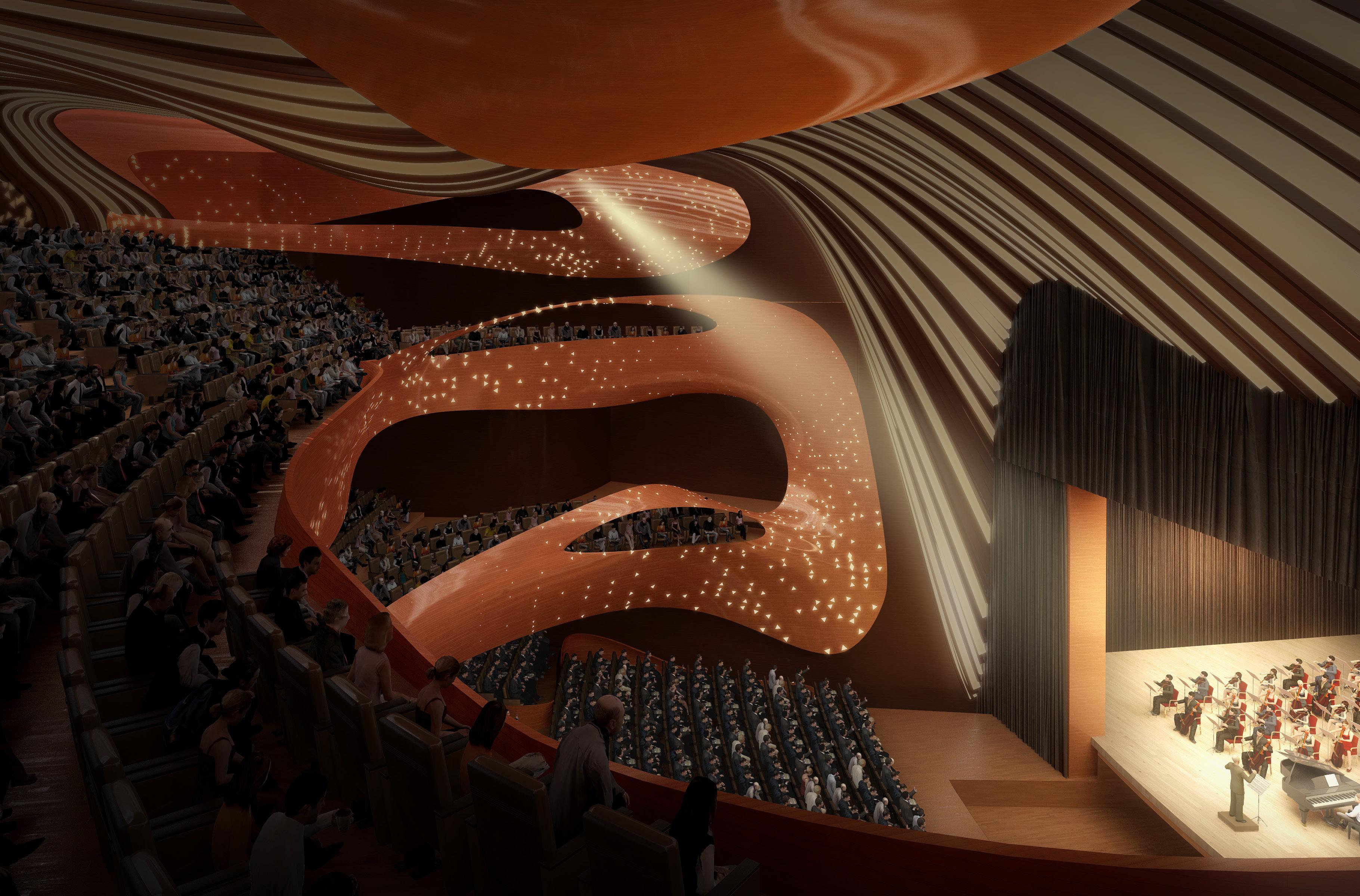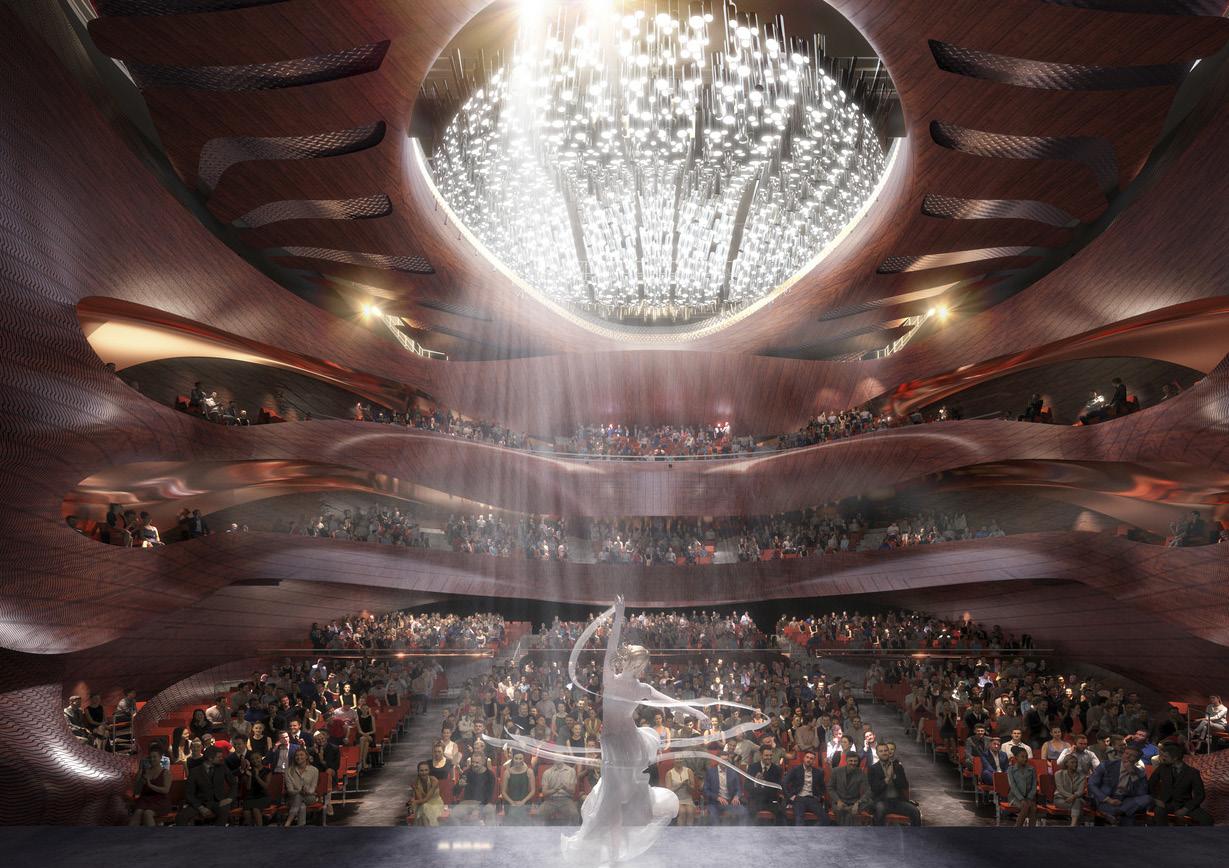 The design of the Longgang International Arts Center seeks to express the lyrical beauty inherent in the forms, details, and materials of traditional musical instruments native to China such as the Pipa, xun, and erhu. More importantly, the design encourages the visitors to imaginatively place themselves inside these musical instruments through invoking their hidden interior spaces and the quality of natural light that enters through their diverse sound and finger openings. The world class performing arts venues, a 1,600 seat grand auditorium and a 600 seat auditorium, and are located in a pavilion recalling the body of a pipa adjacent to the hotel complex and Shenzhen Metro subway stop. A third venue, an experimental black box capable of entertaining over 300 patrons for music, dance or lecture events, is housed in freestanding pavilion in the grand event courtyard that evokes the form and materiality of a xun. The goal of uniting the entire experience of arrival in the grand event courtyard and dramatic preshow foyers with the three venues is to provide a continuous immersive experience of entertainment. The performance venues are complimented by a dramatic 2,000 sm multipurpose hall, foyer bars, and a ground level café. World class accommodations for the performers include three rehearsal halls, VIP dressing rooms, and stateof-the-art scenographic rigging and audiovisual mixing. The design strives to establish meaningful connections between Huangjinshan Park and the central event courtyard while the colonnade along Beier Road provides a grand urban façade for visitors.