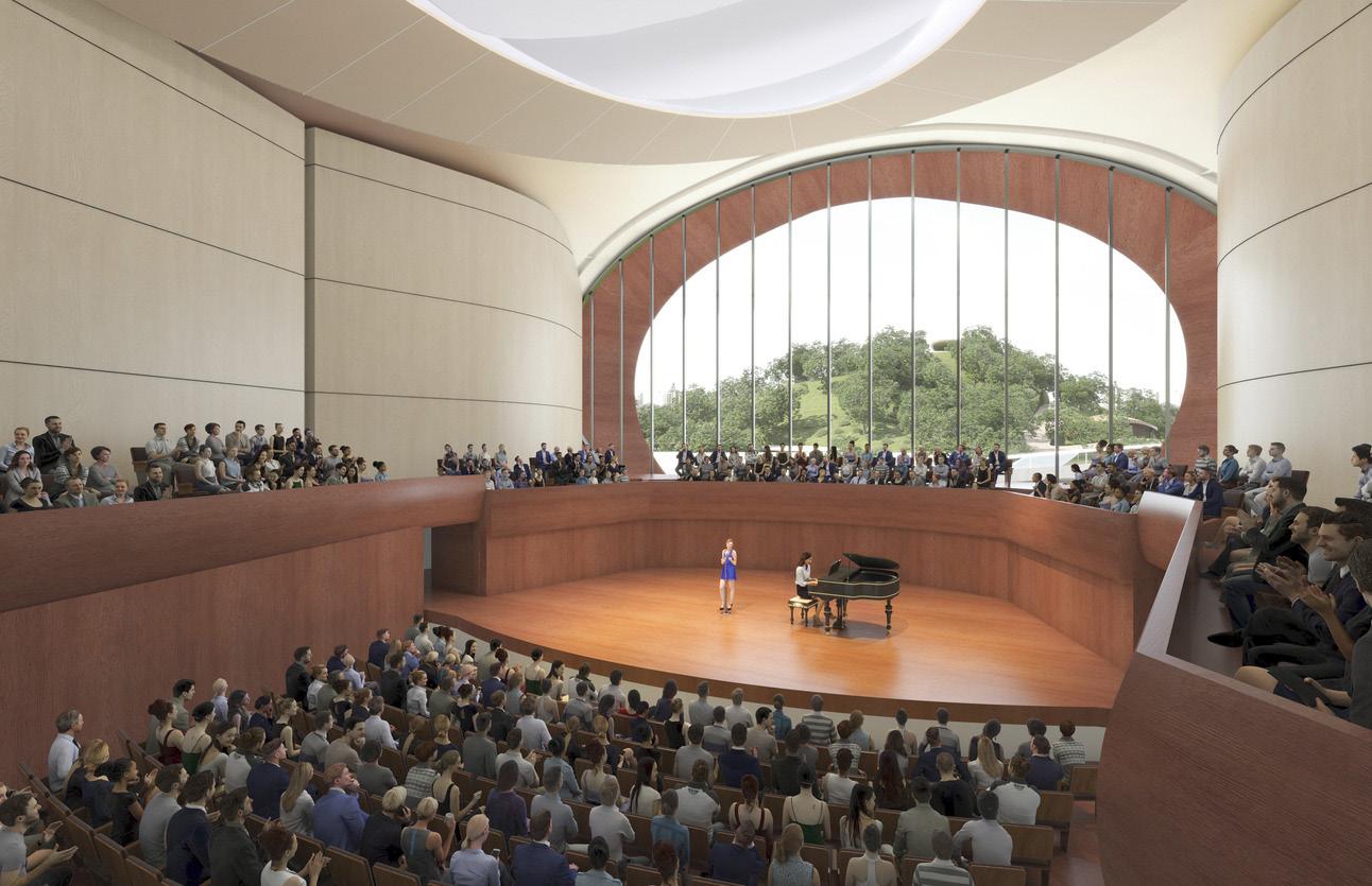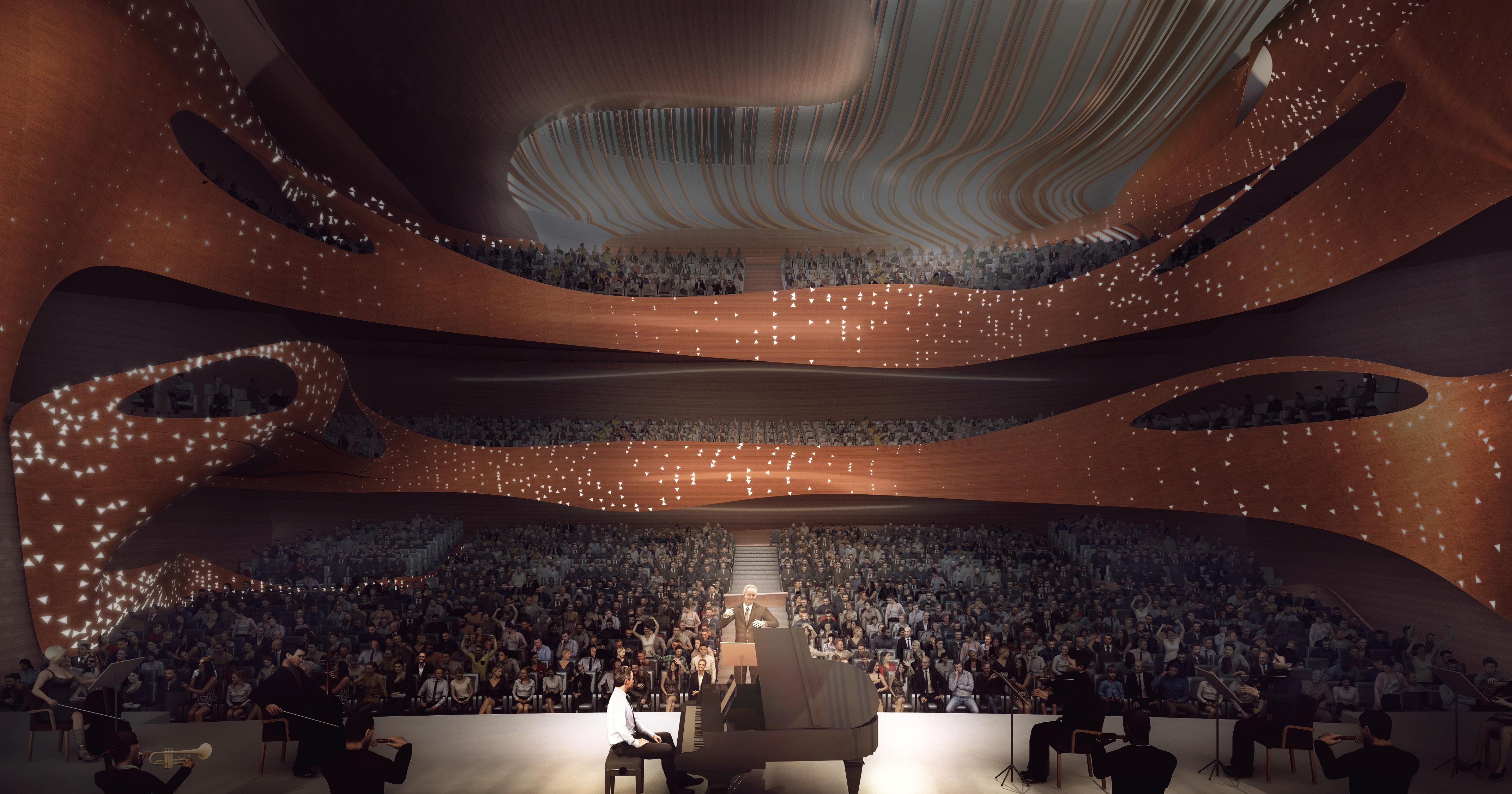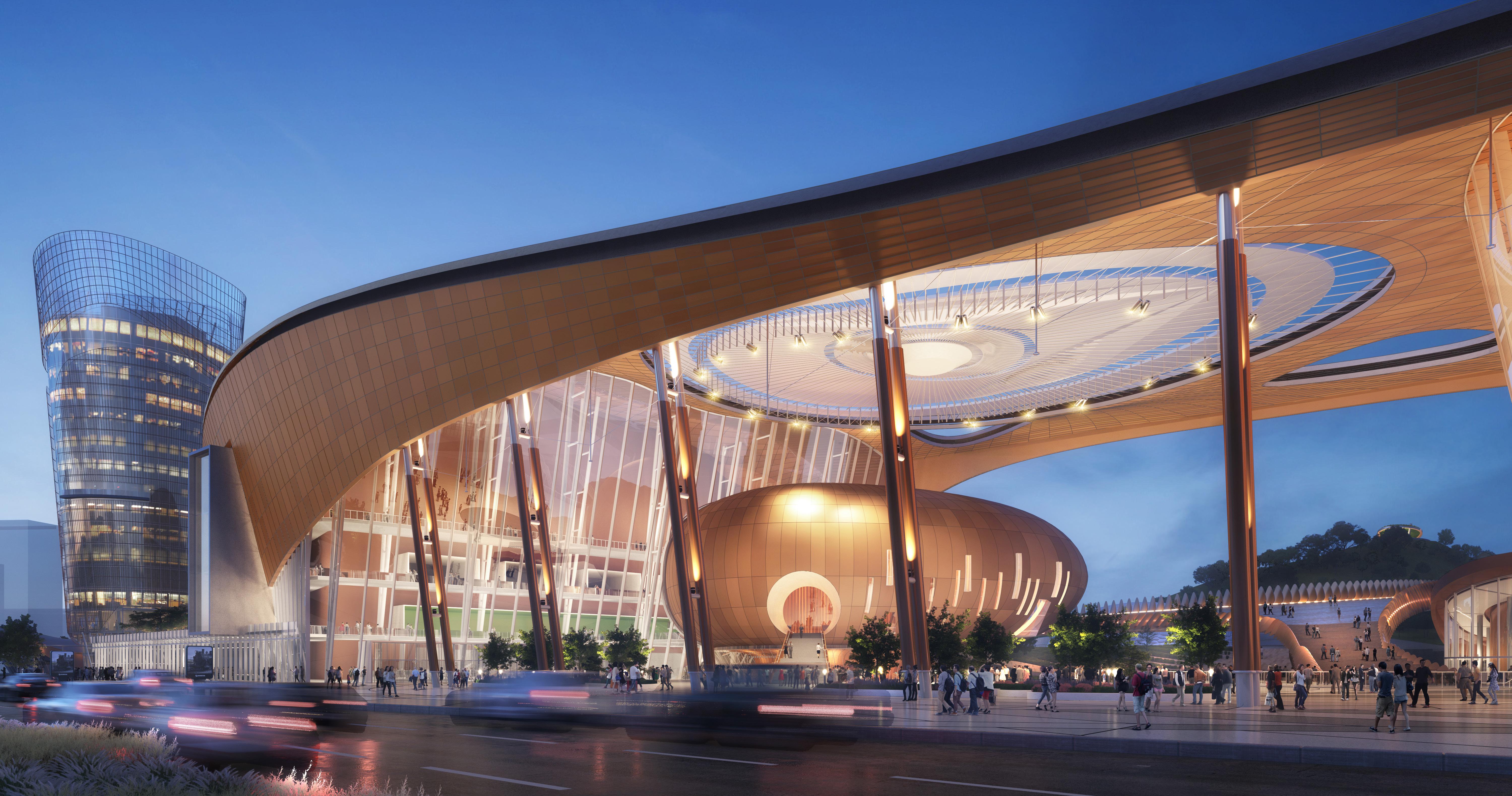 The design of the Longgang International Arts Center seeks to express the lyrical beauty inherent in the forms, details, and materials of traditional musical instruments native to China such as the Pipa, xun, and erhu. More importantly, the design encourages the visitors to imaginatively place themselves inside these musical instruments through invoking their hidden interior spaces and the quality of natural light that enters through their diverse sound and finger openings. The world class performing arts venues, a 1,600 seat grand auditorium and a 600 seat auditorium, and are located in a pavilion recalling the body of a pipa adjacent to the hotel complex and Shenzhen Metro subway stop. A third venue, an experimental black box capable of entertaining over 300 patrons for music, dance or lecture events, is housed in freestanding pavilion in the grand event courtyard that evokes the form and materiality of a xun. The goal of uniting the entire experience of arrival in the grand event courtyard and dramatic preshow foyers with the three venues is to provide a continuous immersive experience of entertainment. The performance venues are complimented by a dramatic 2,000 sm multipurpose hall, foyer bars, and a ground level café. World class accommodations for the performers include three rehearsal halls, VIP dressing rooms, and stateof-the-art scenographic rigging and audiovisual mixing. The design strives to establish meaningful connections between Huangjinshan Park and the central event courtyard while the colonnade along Beier Road provides a grand urban façade for visitors.