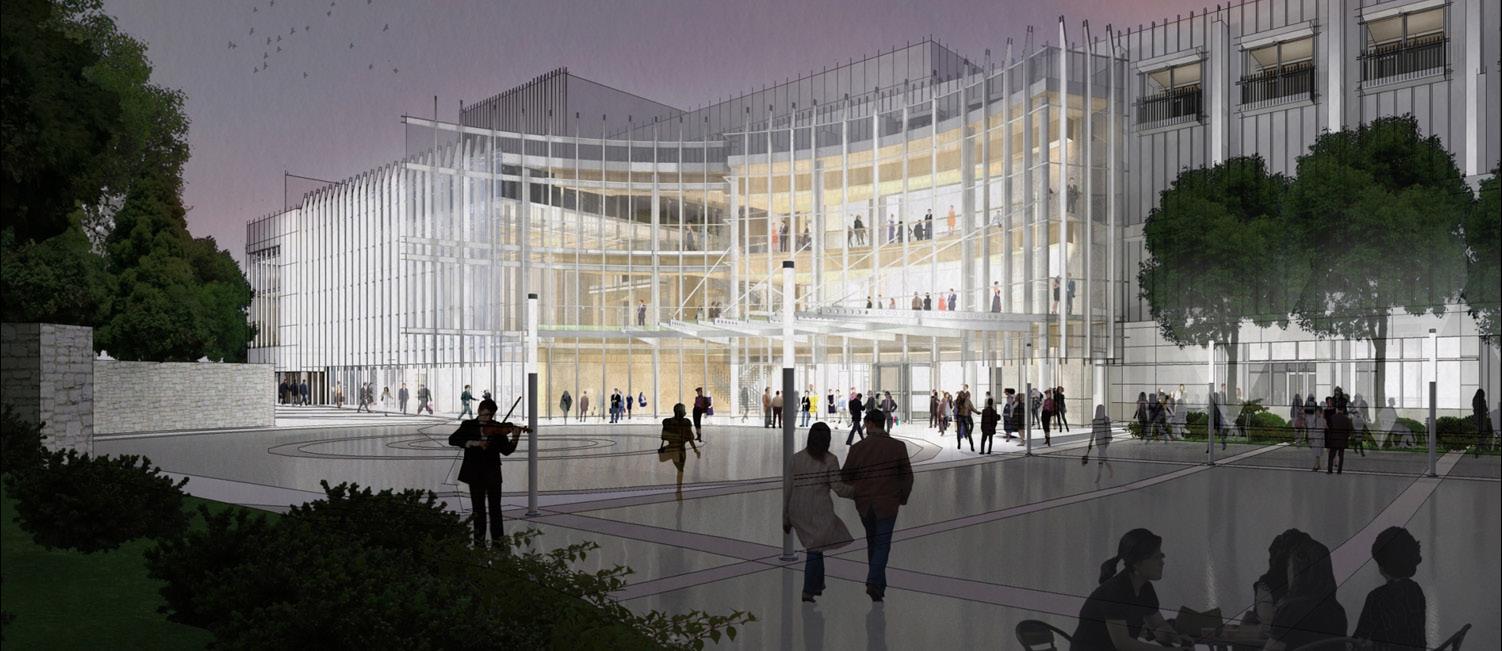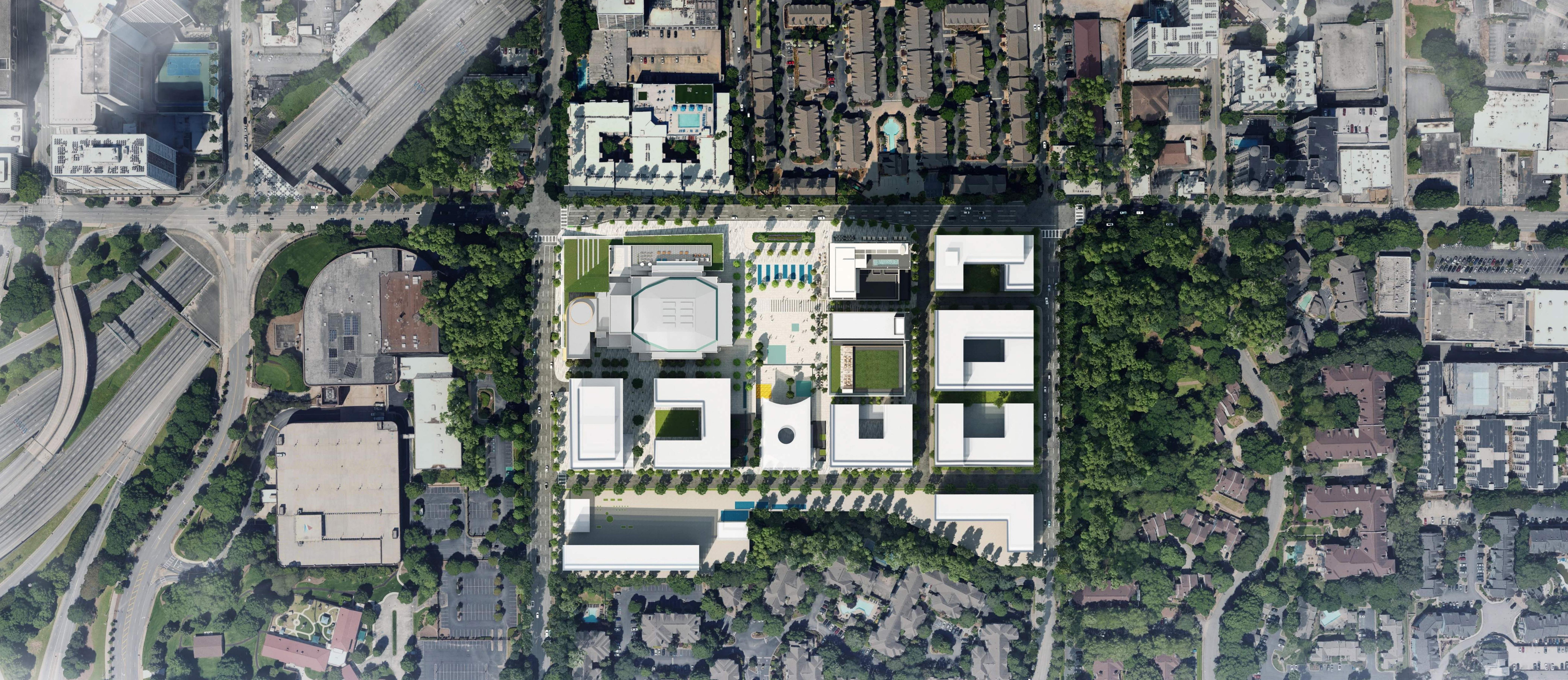 The renovated and expanded performing arts center is envisioned as discreet glass facade capped with an accessible landscape. The design allows the original, historic center to remain primary and visible from the street. This discreet addition houses a new 500 seat theater and supplements the existing facility with rehearsal, artist, and operational spaces. The attraction is envisioned as a sensitive addition to the west and south of the civic center, one that reinforces the landmark’s relationship to the large public plaza to the north, while providing an iconic street presence along both Piedmont and Ralph McGill.